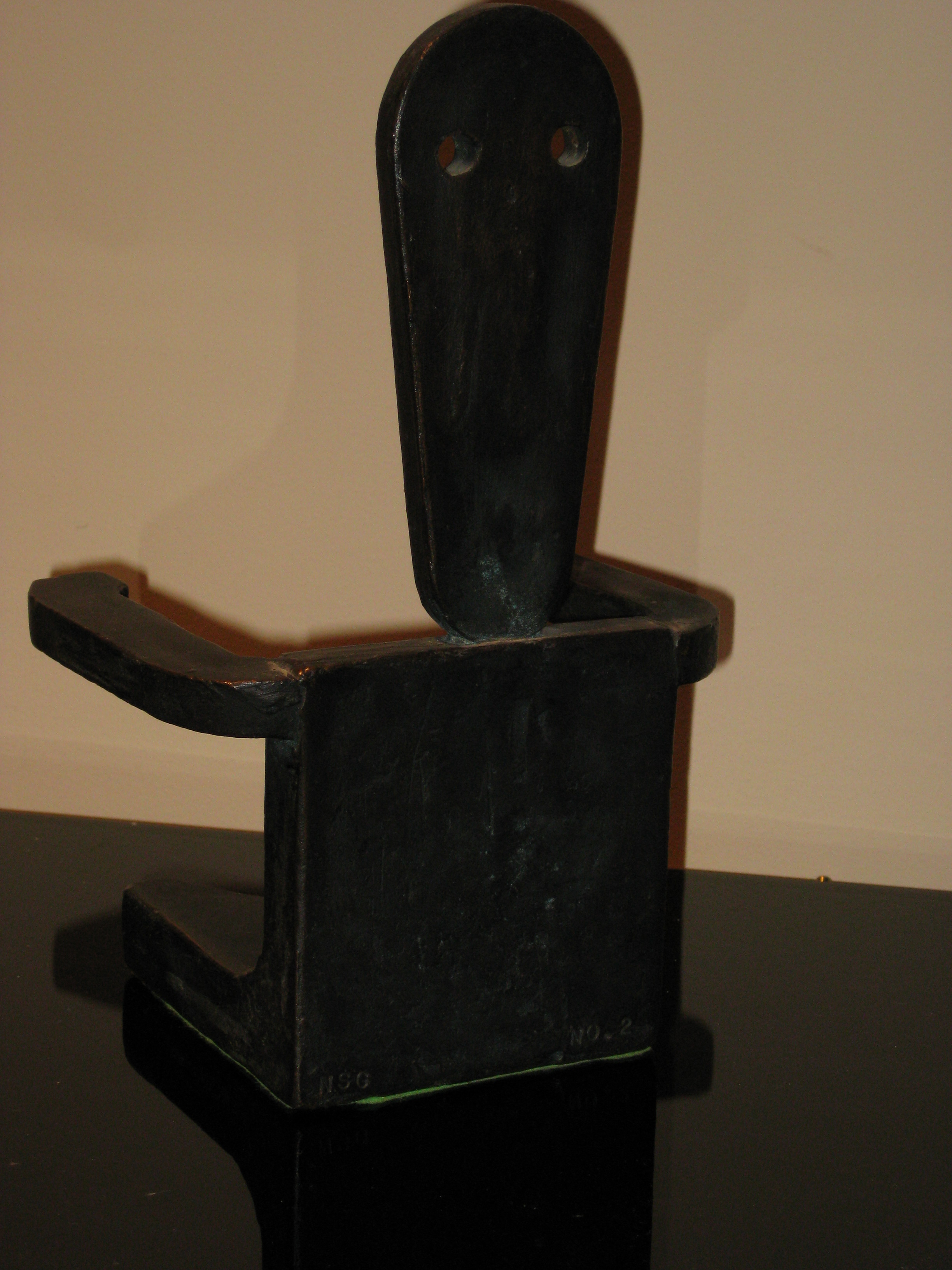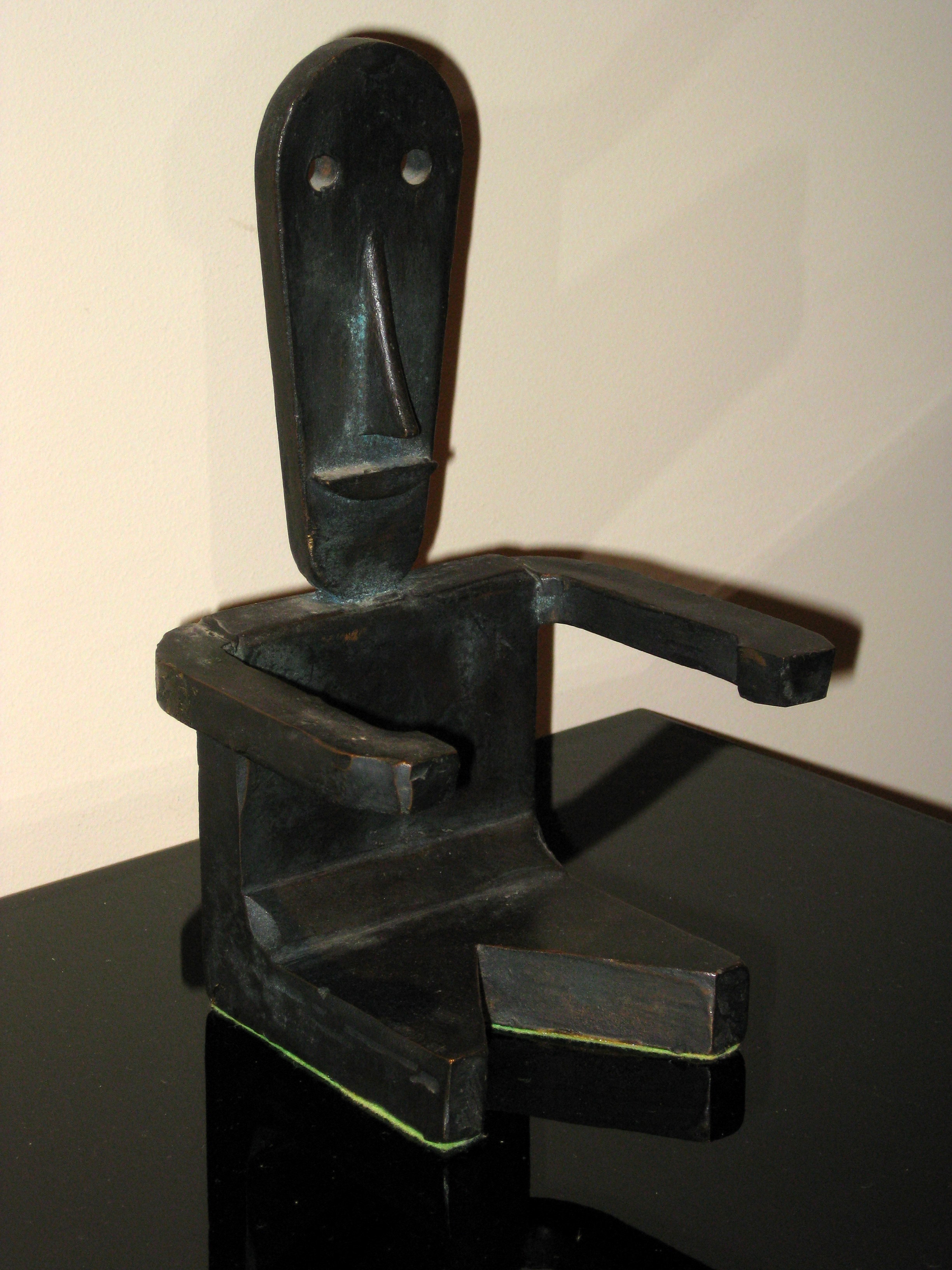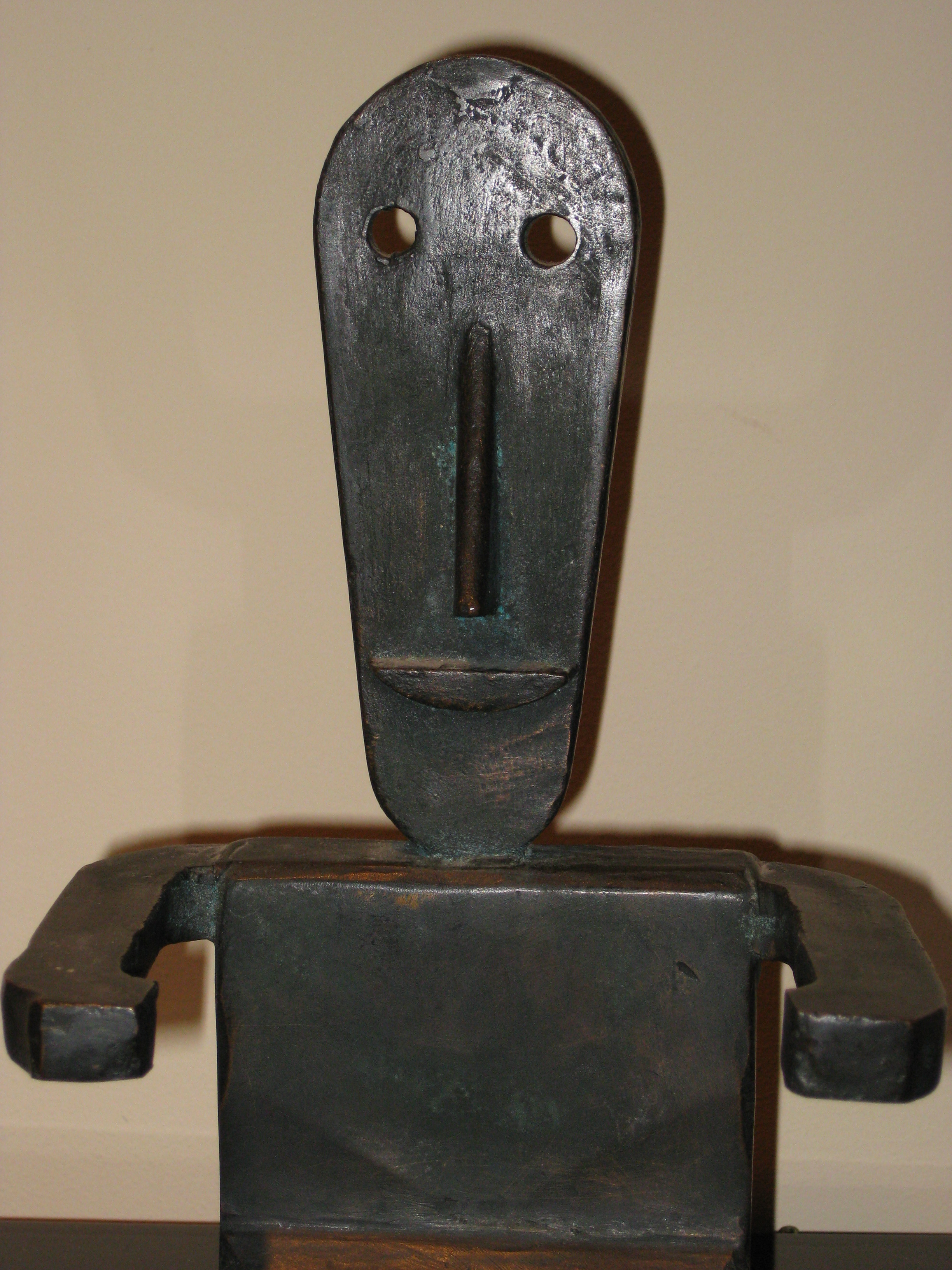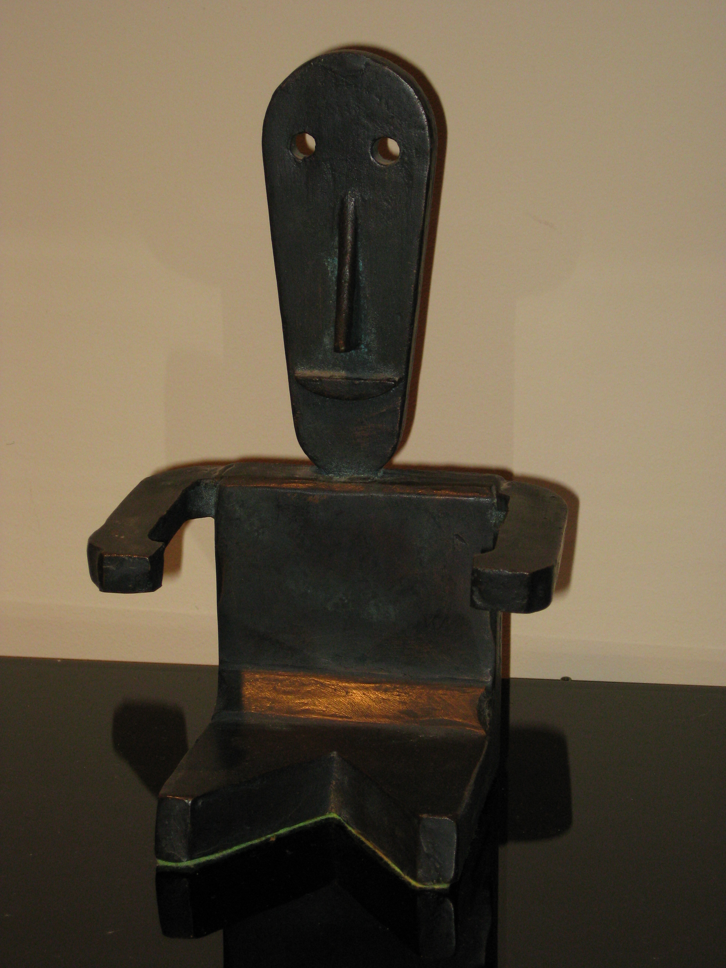 Description: A seated figure is represented by simple geometric forms. His oblong-shaped face is defined by a triangular nose, a thin crescent-shaped mouth, and small round holes for eyes. His arms are raised horizontally in front of him, parallel to his triangular legs.