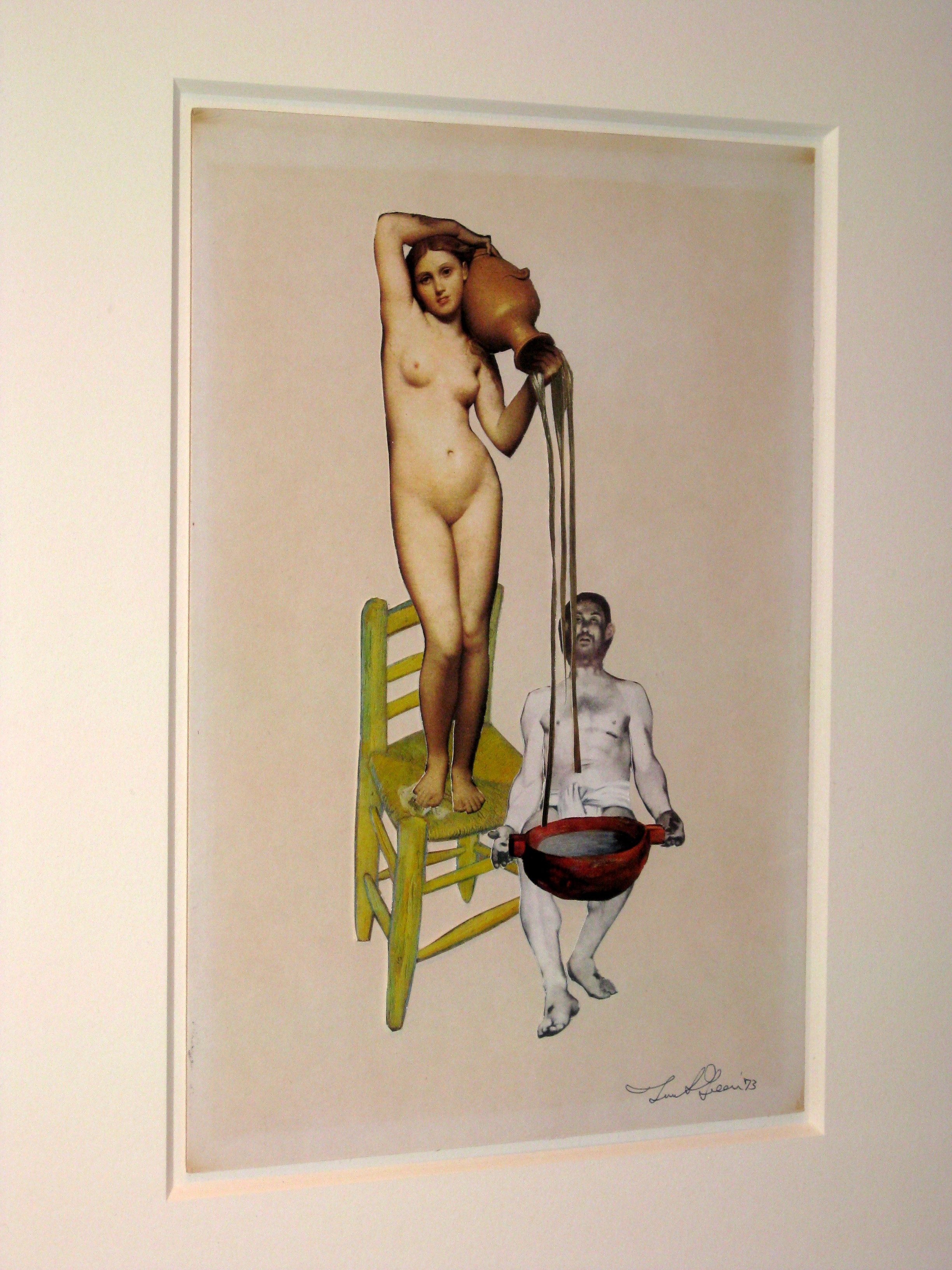 Description: A nude woman with a water jug in her hands (La Source, 1820-1856, Jean Auguste Dominique Ingres, French, Montauban 1780-1867 Paris, Musee d’Orsay) stands on a chair (Bedroom in Arles, 1868, Vincent van Gogh, Dutch, Zundert 1853-1890 Auvers-sur-Oise, Van Gogh Museum, Amsterdam). She tilts it forward so that water pours out of it. The water is being collected in a vessel (unidentified) that is being held by a nude man (The Dead Christ with Angels, 1864, Edouard Manet, French, Paris 1832-1883, Paris, The Metropolitan Museum of Art) below.