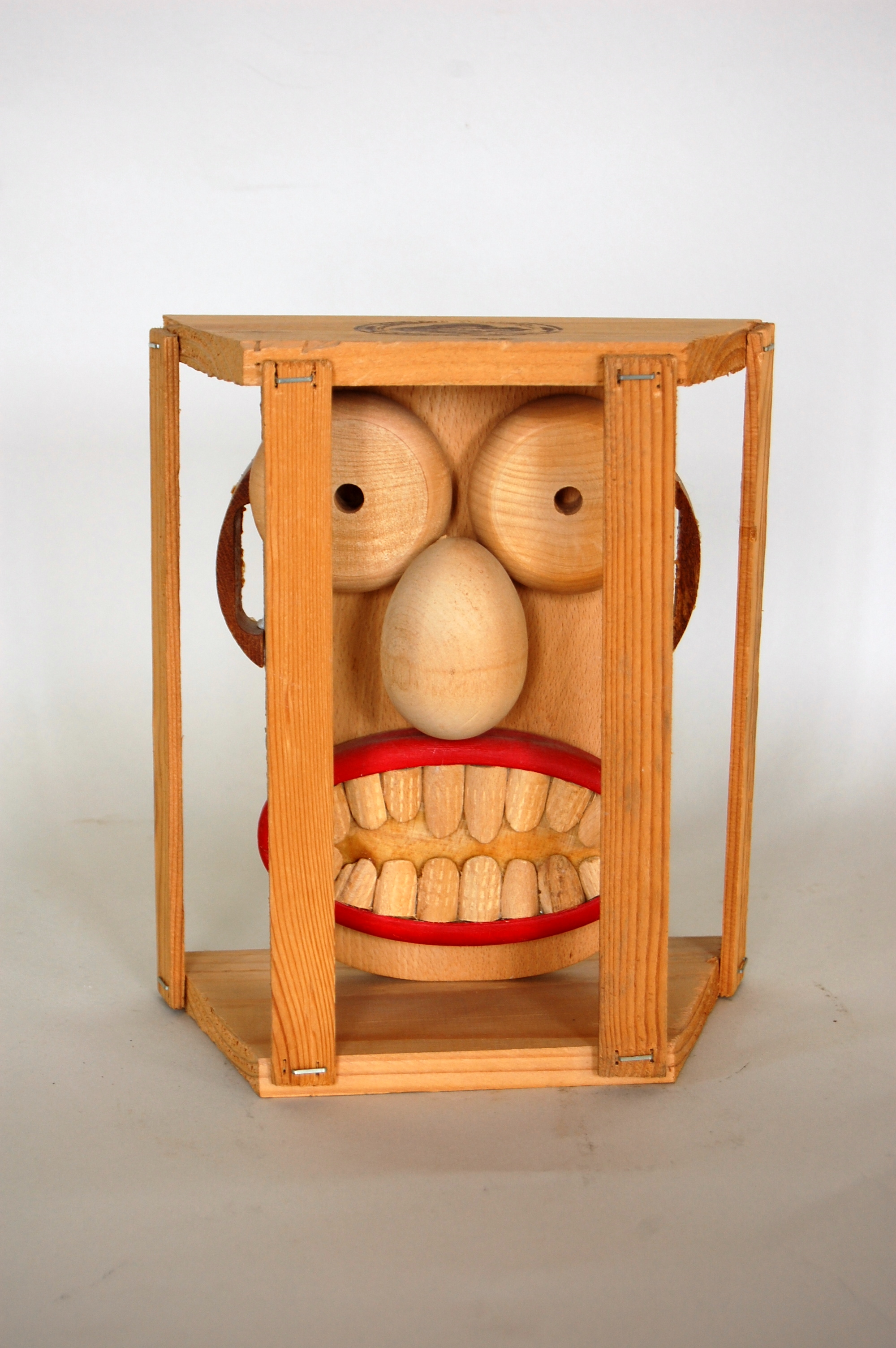 Description: A wooden form shaped like a basket with half-hexagonal sides and only four cross supports is placed vertically on one of its sides with the bottom of the basket facing the viewer. Situated in this manner, the sides of the basket appear as a base and top for the piece and the cross supports appear as vertical bars of a jail cell. A wooden board with a rounded bottom is placed inside of the basket area and is detailed to represent a face. Two identical round wooden forms with holes drilled through them represent eyes, an egg-shaped wooden form represents a nose, and a wooden ring painted red represents the mouth. Carved wooden forms shaped like teeth line the interior of the oval-shaped mouth and appear clenched, emphasizing the gnarled look on his face. Arched wooden forms are attached to each side of his head, representing ears.