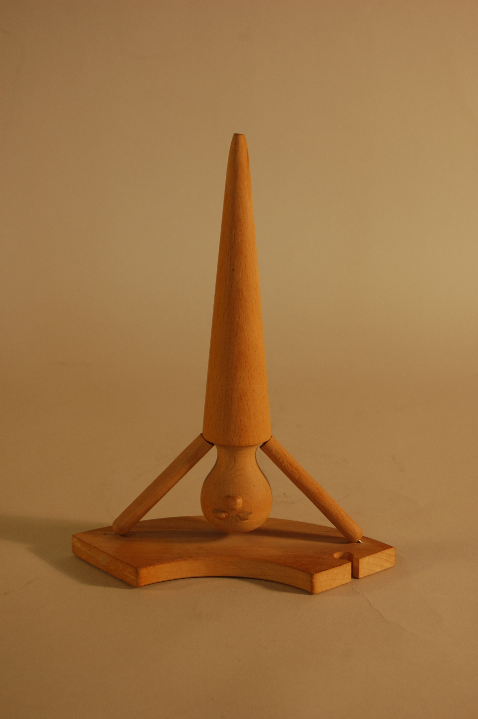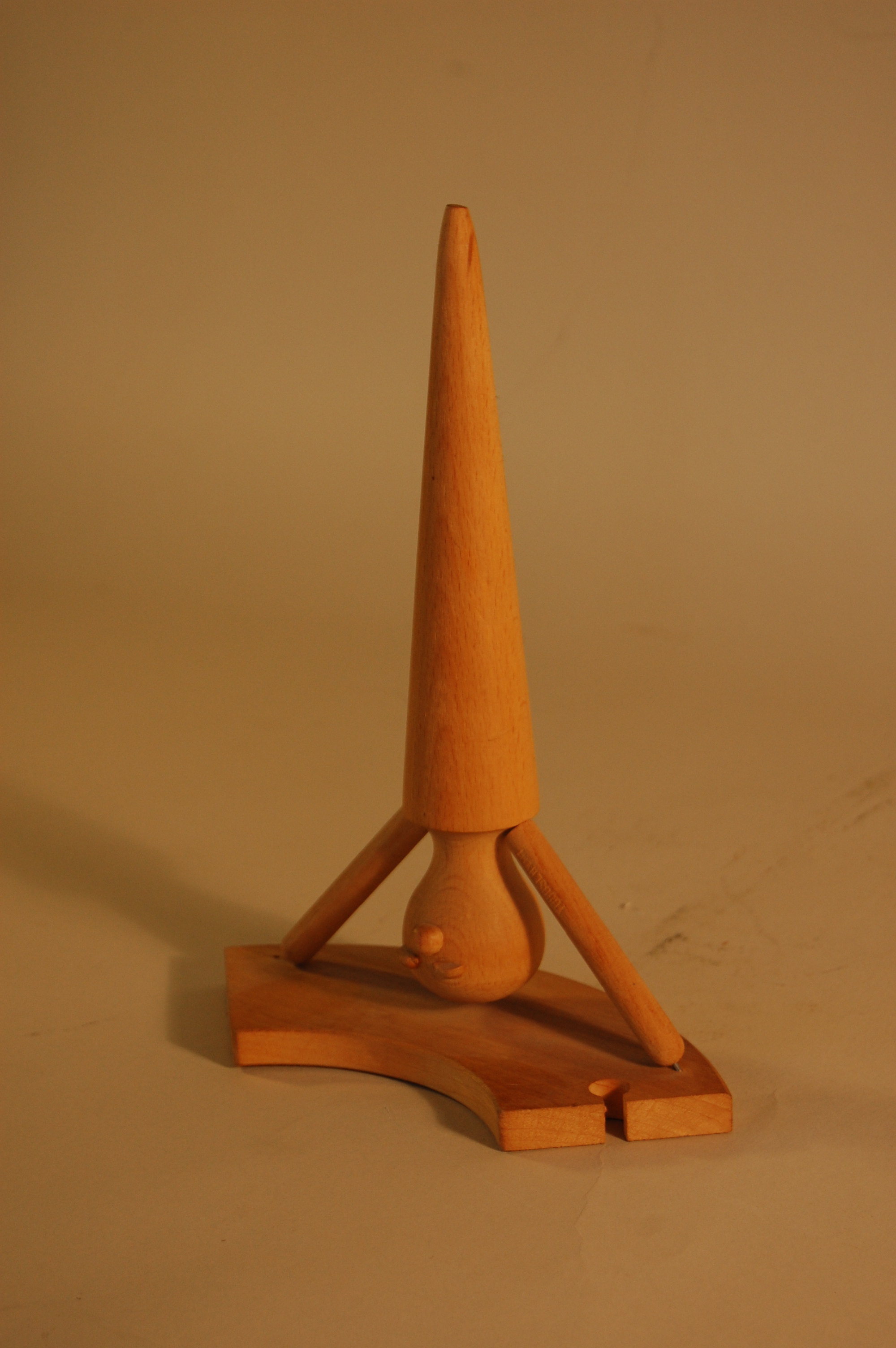 Description: In this piece, a figure performs a headstand on a curved fragment of wooden toy railroad track. A bulb-shaped wooden form represents his upside-down head. Small wooden forms are attached to its surface, representing a nose and eyes. Two thin, cylindrical wooden sticks extend from his shoulders on either side of his body and touch the base, representing arms supporting his headstand. A narrow, wooden cone is attached to the man’s neck and extends upwards, ending in a point, representing the man’s body balanced in midair.