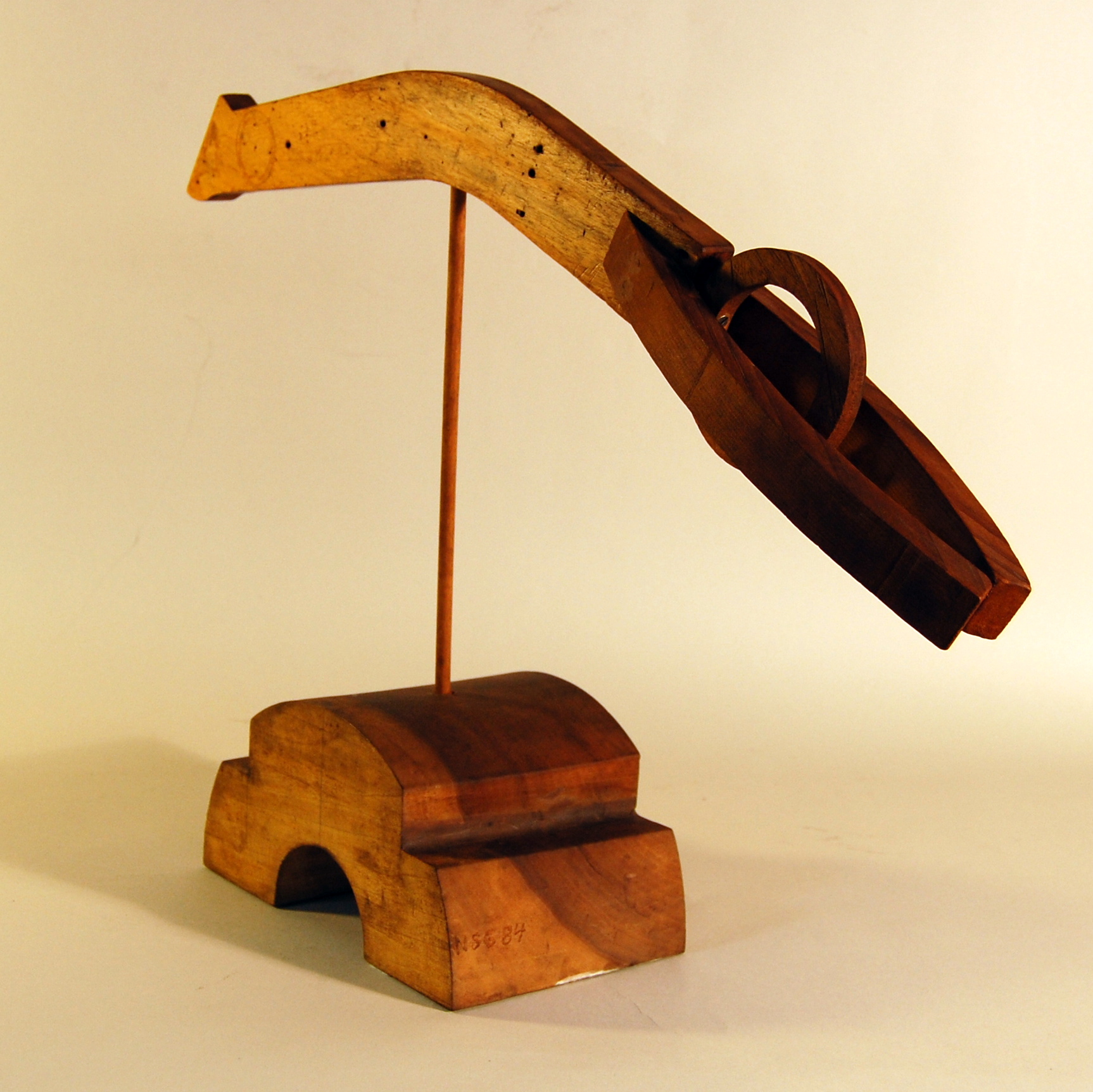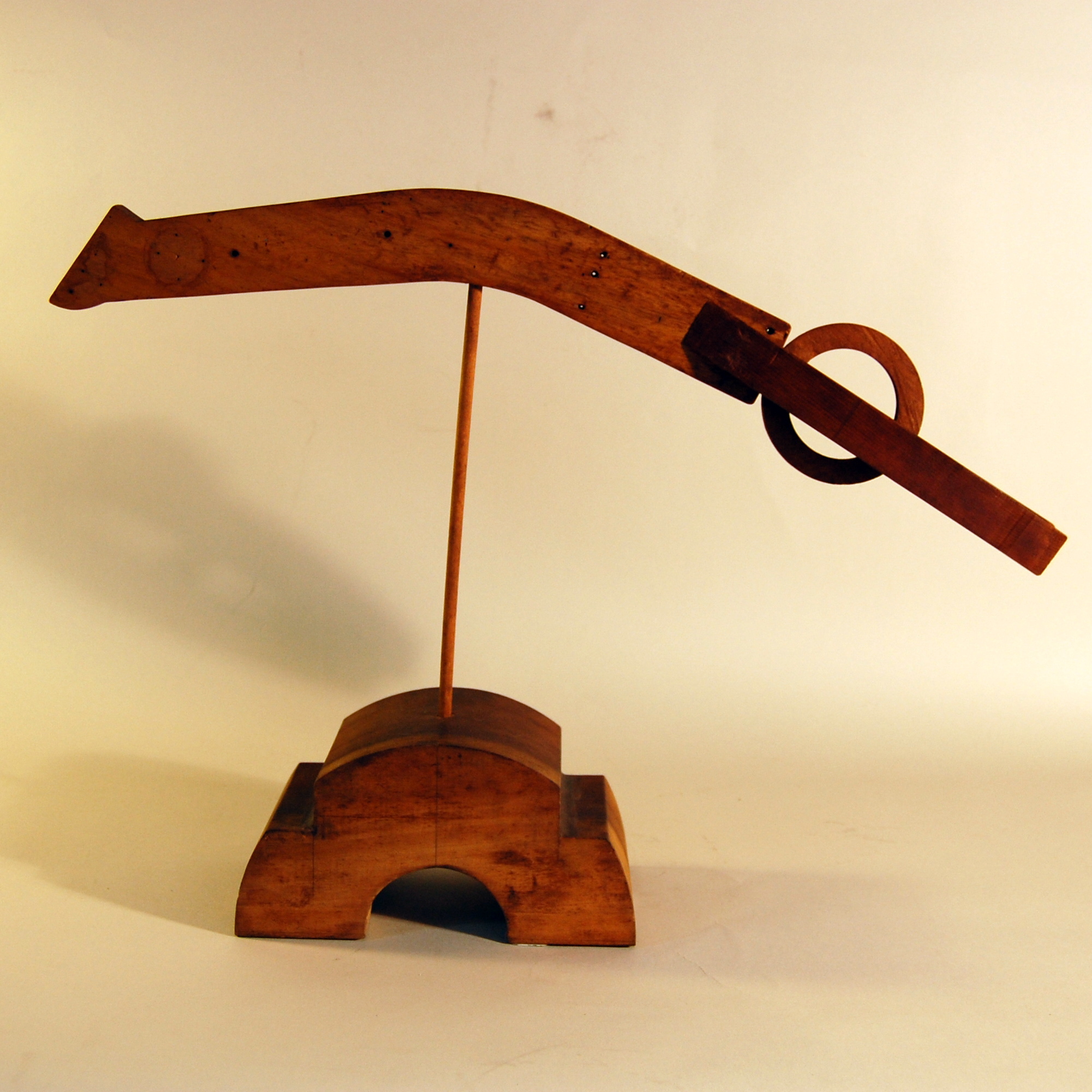 Description: An arched wooden form represents the body of a diver. A ring shaped wooden form is attached to one end, representing the diver’s head. Two identical wooden curves are attached on either side of the diver’s head, curving toward one another, representing arms in a diving position. A thin cylindrical wooden stick connects the diver to a thick, arched wooden base below. Its form is similar to that of a weather vane.