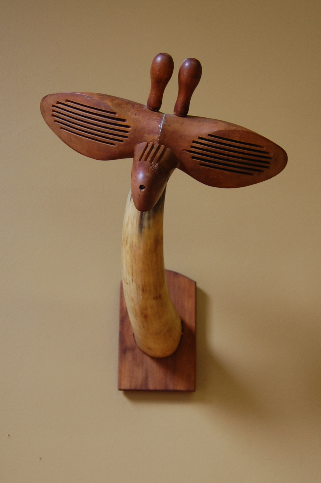 Description: A rectangular wooden board with an arched top serves as a base for this wall-mounted piece. The form of a giraffe’s head is mounted in a similar manner to how the head’s of trophy game animals are mounted. An animal horn represents the giraffe’s neck, its thicker portion connected to the base. Two wooden shoe lasts are attached to each other horizontally at the ankle and to the tapered end of the animal horn, representing the giraffe’s eyes. The heel portion of a wooden shoe last projects from the area where the two eyes meet, representing the giraffe’s nose. Two identical, small, rounded wooden forms are attached vertically at the top of the giraffe’s head, representing ears.