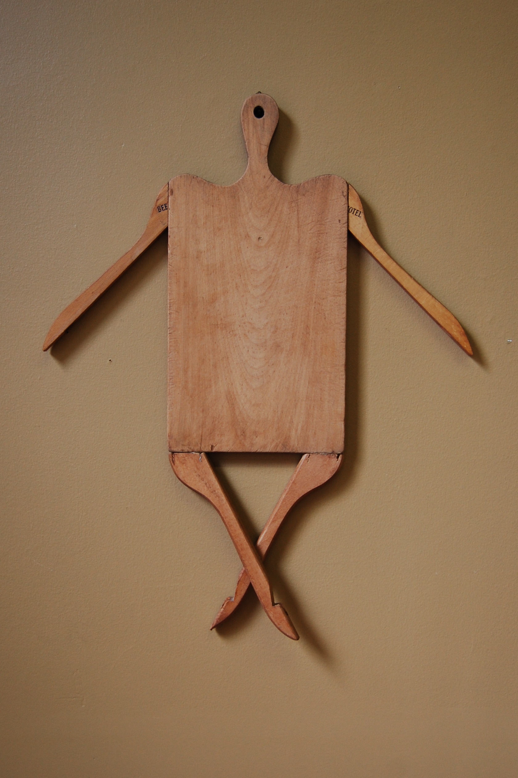 Description: A wooden assemblage represents a person who appears as though he or she is performing a ballet jump known as the Changement. A rectangular wooden cutting board placed vertically represents the dancer’s body. The handle at its top represents the dancer’s head. Attached to the board are wooden forms that represent appendages. Two identical wooden forms that appear to be arms of hangers are attached to each side of the cutting board, representing outstretched arms. Two other identical wooden hanger arms with a small indentation on each tip represent legs with pointed toes. The legs are crossed one on top of the other, with toes pointed downward. This person appears to be jumping gracefully, perhaps in a Changement.