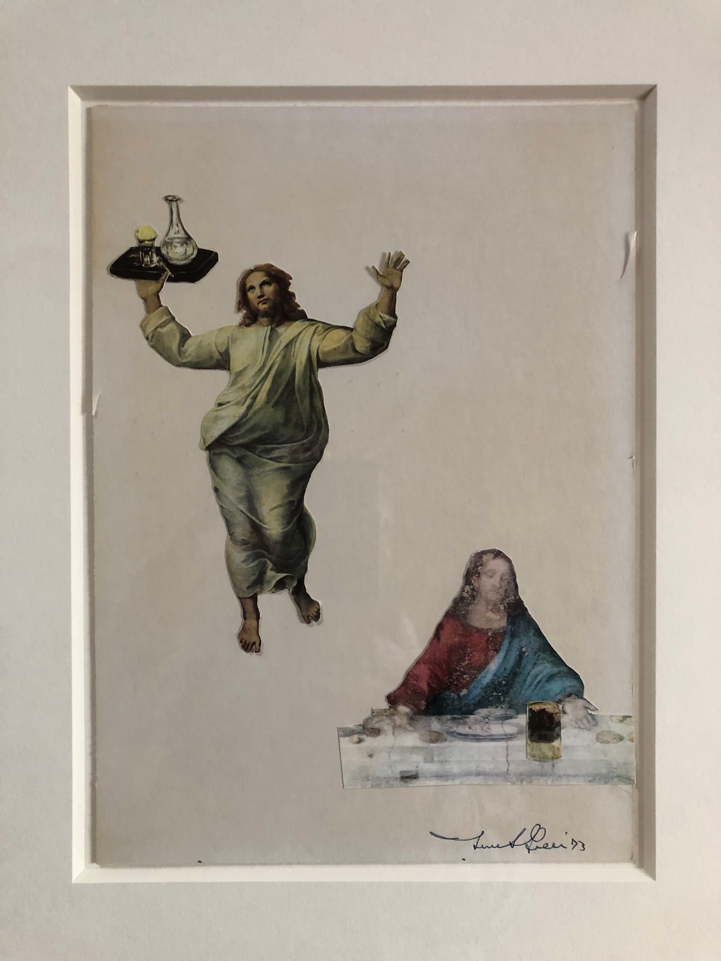 Materials and Techniques: White paperboard, cutouts from reproduction postcards and/or art books, mounted and placed in a frame.