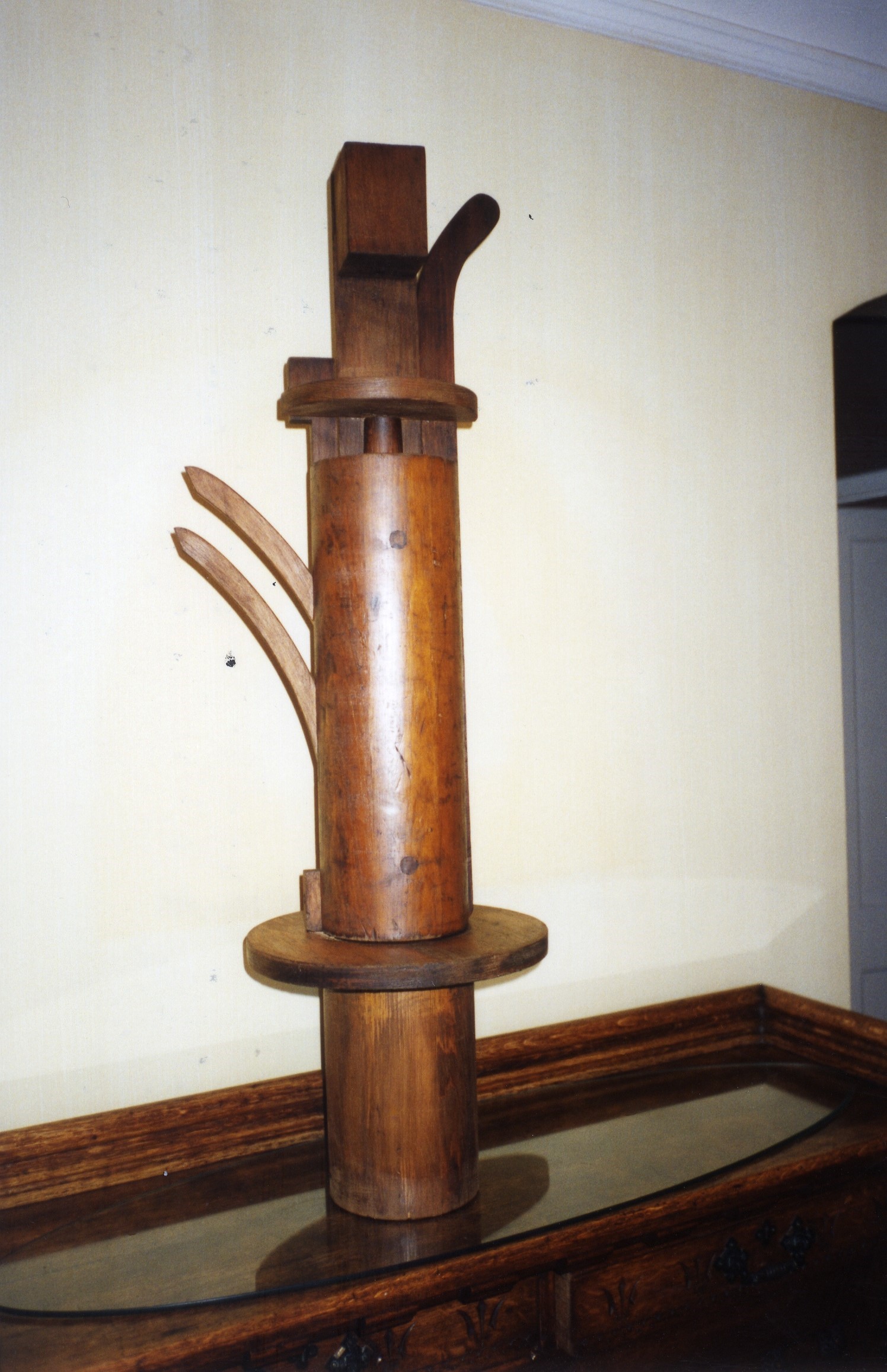Materials and Techniques: Wooden cogs, wood hangers, assorted wooden forms