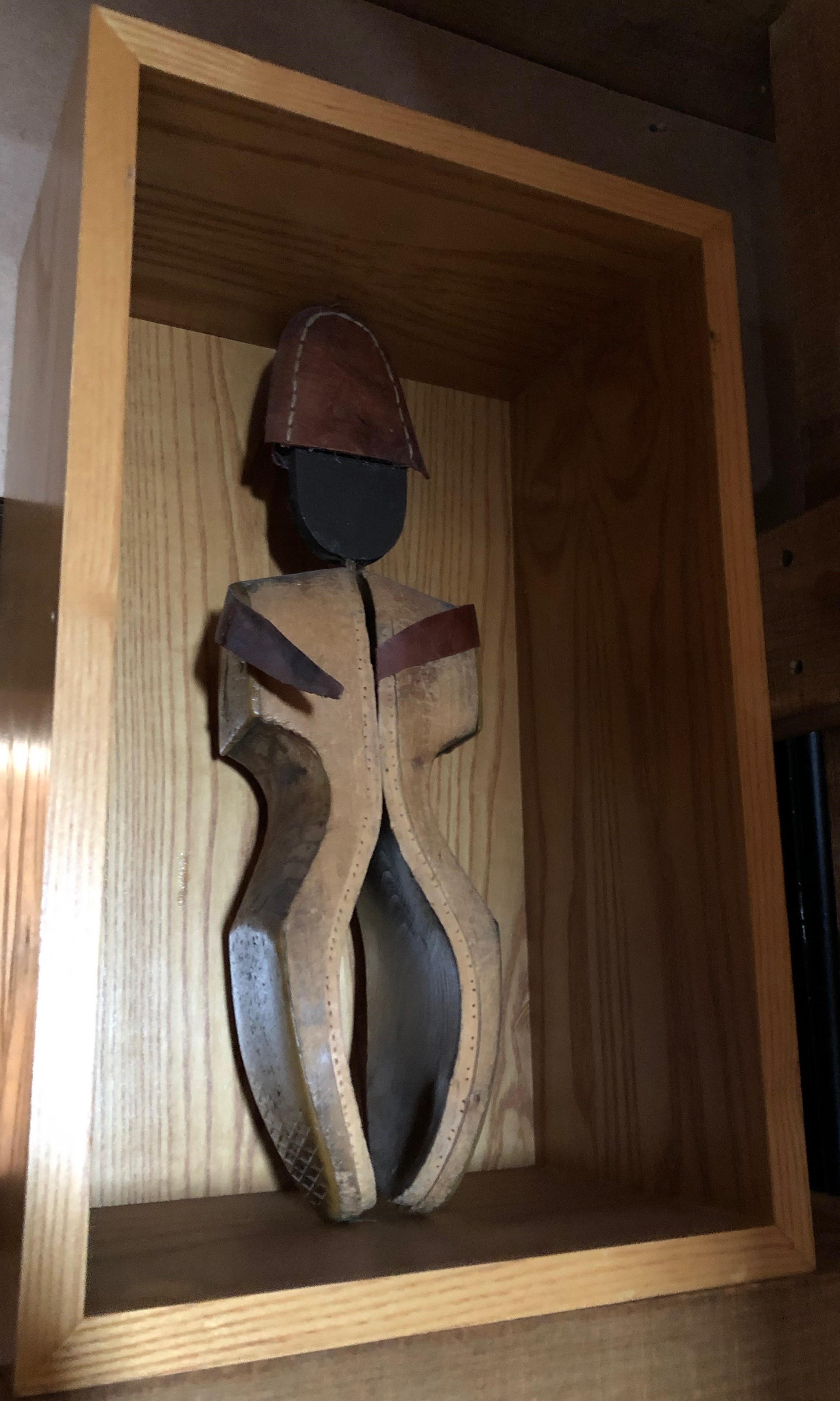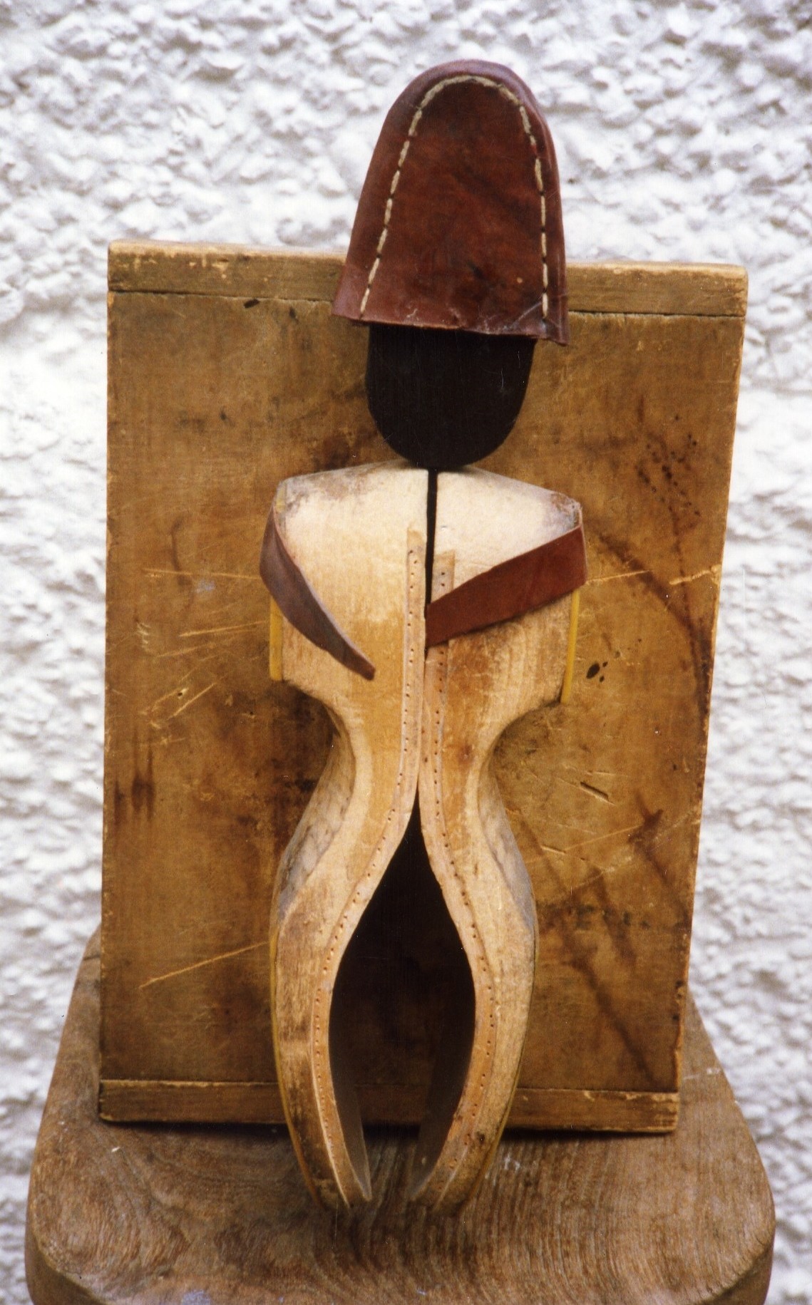 Materials and Techniques: Cloth, twine, wood board, assorted wood pieces, leather parts, wooden shoe soles