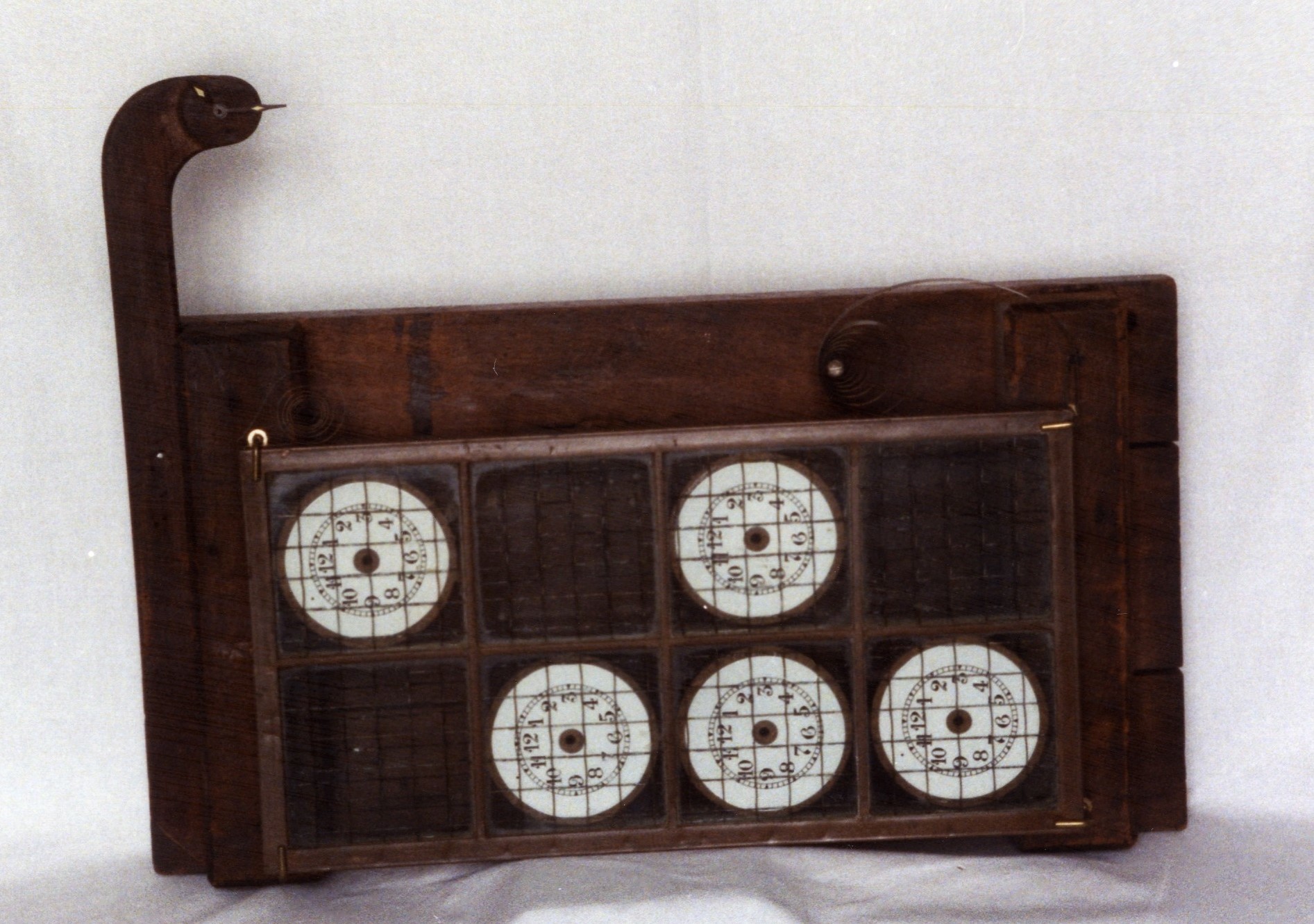 Description: A metal screen with eight square panels is attached to a wooden board. White rotary phone dials are attached to the wooden form behind five of the panels. Another wooden form lies across the top of the wooden board, extends to the right, and curves down.