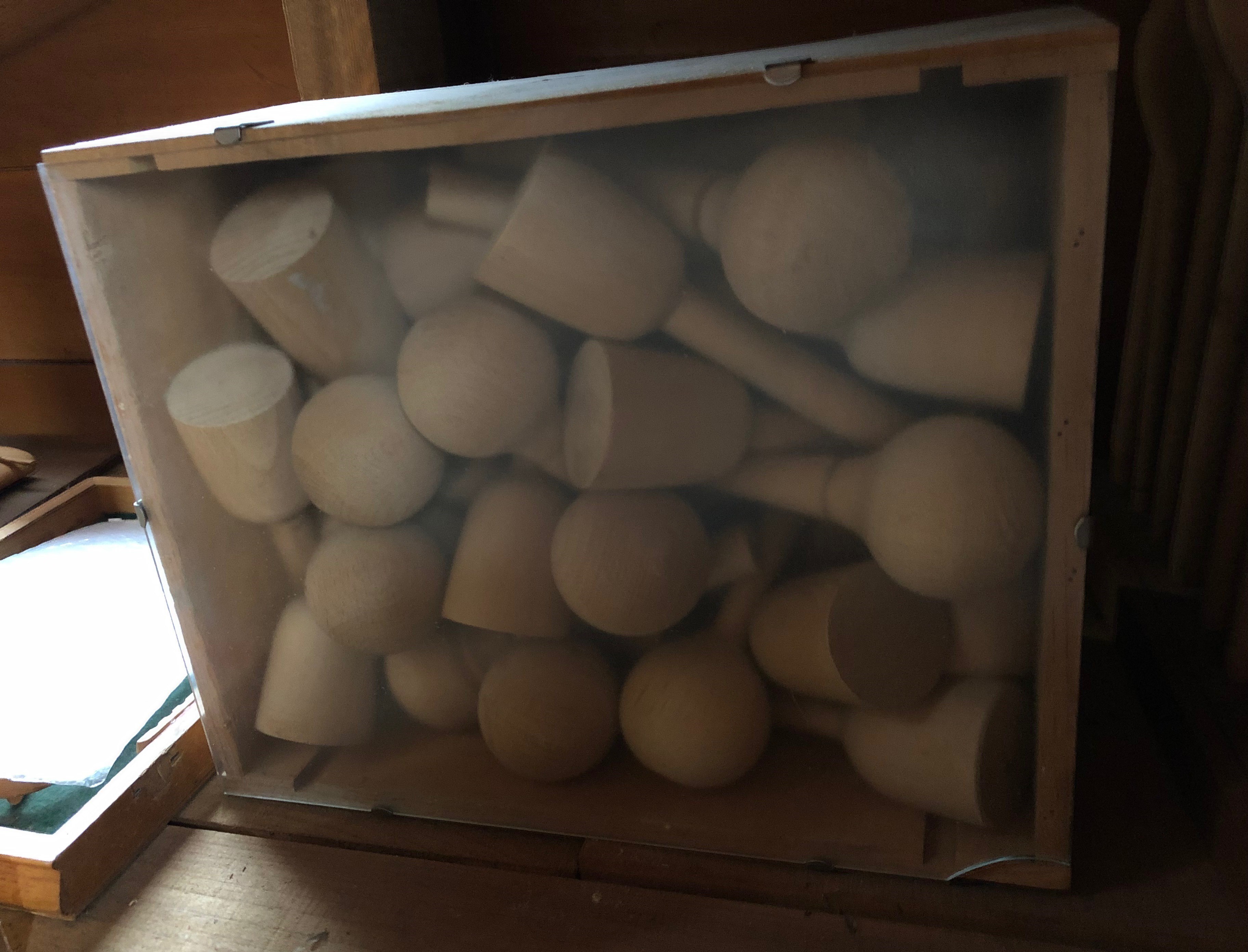 Description: inside this box with a glass lid is wood pieces packed tightly together. They are all a similar size, either round with a handle or flat with a handle.