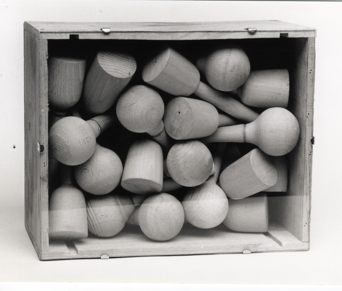 Subject: Abstract sculpture. Box filled with wood objects.