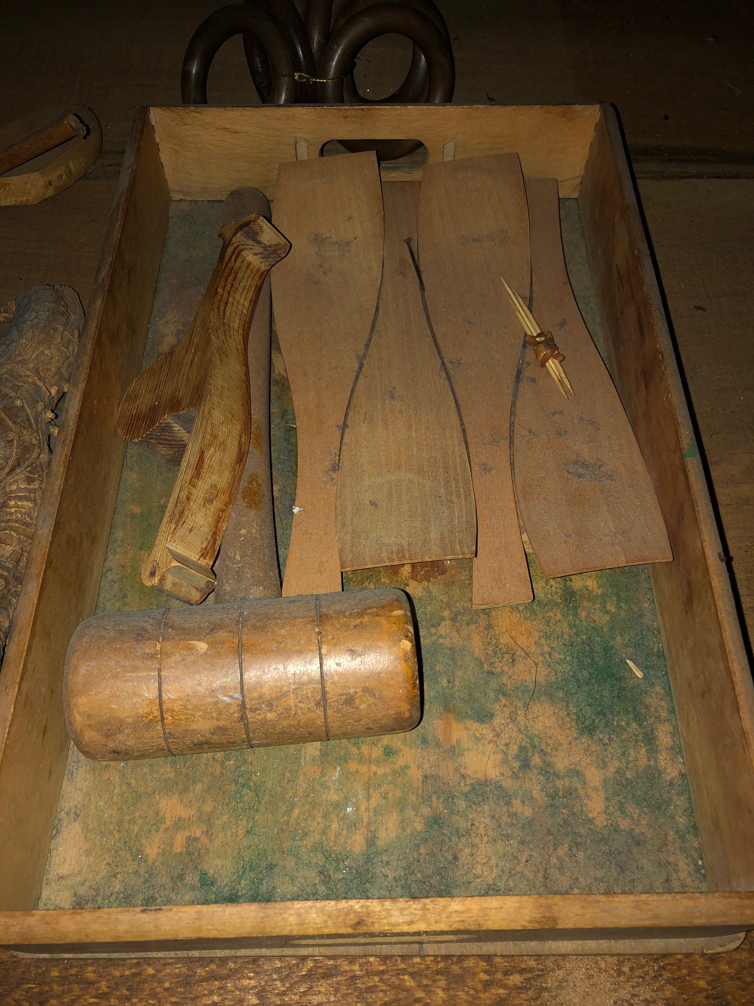 Description: Inside a wooden serving tray are various wood pieces of different shapes. Unfortunately this piece is unrecognizable to what it once was.