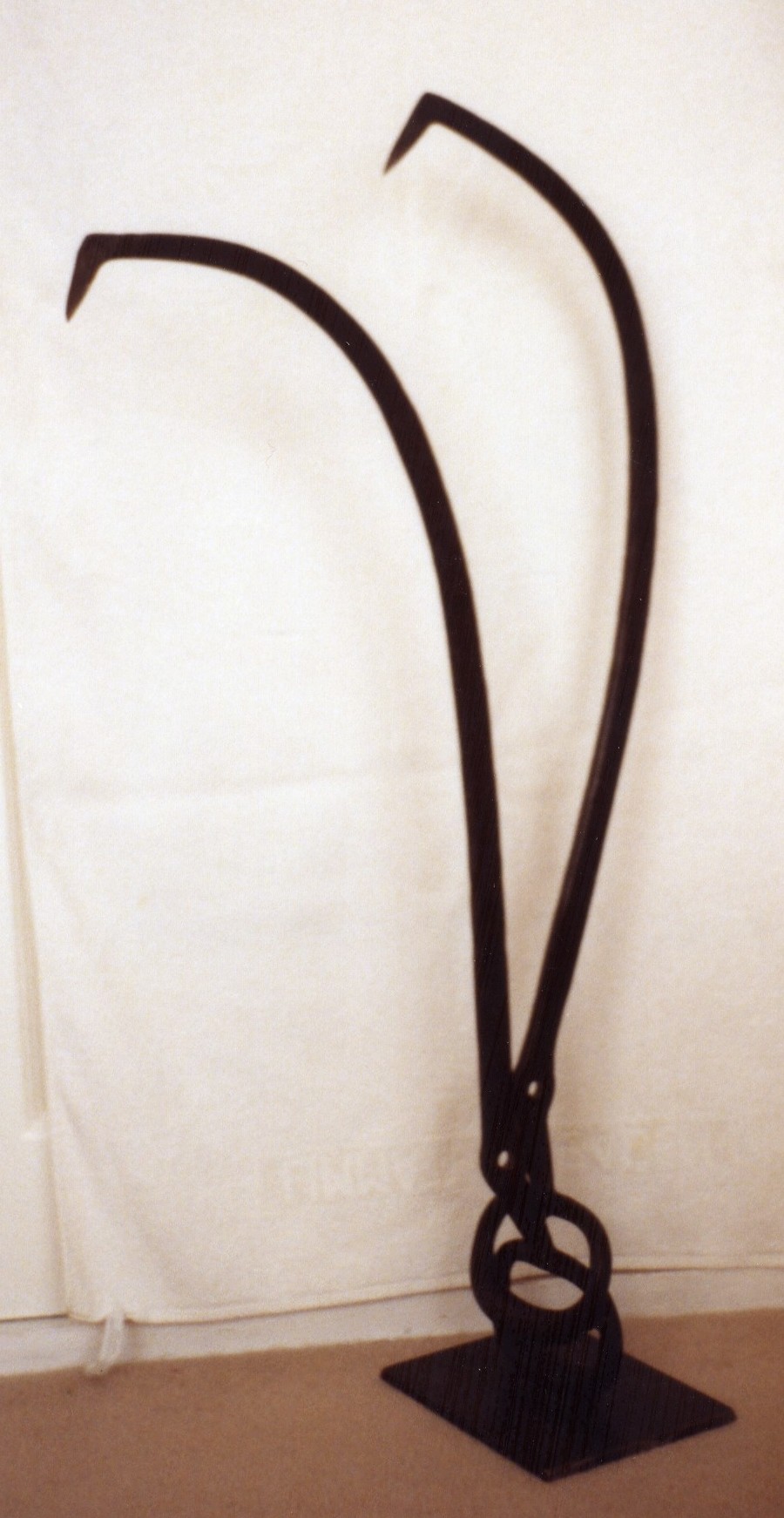 Description: Long metal pieces resemble two upright cobras with pointed heads. It is attached to a flat metal base.