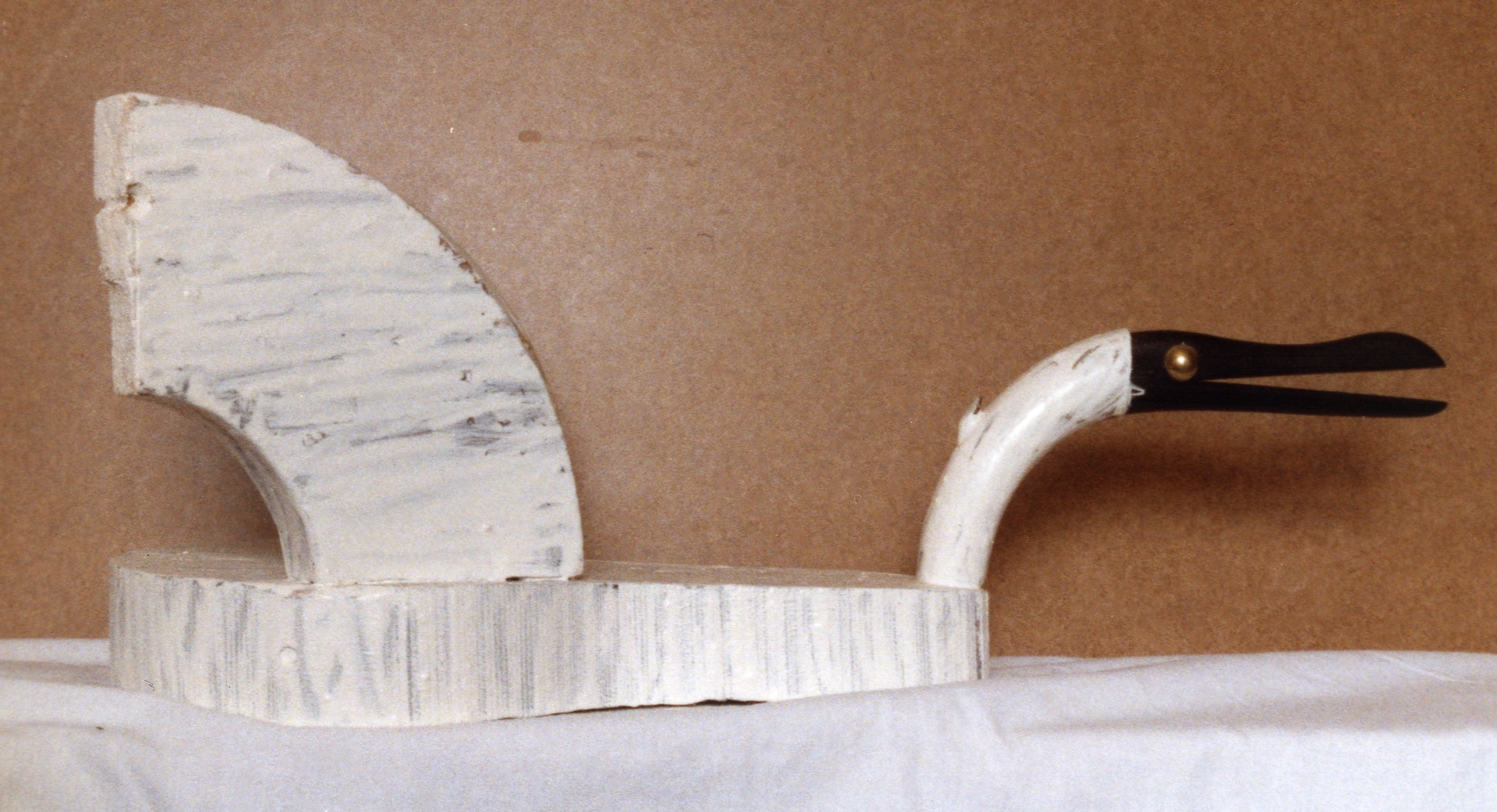 Description: This painted white swan is made up of 4 wood pieces of varying shape and size. One piece represents the tail, one the body, one the neck, and one the head. The head is black with its beak open and a small bronze orb for the eye.