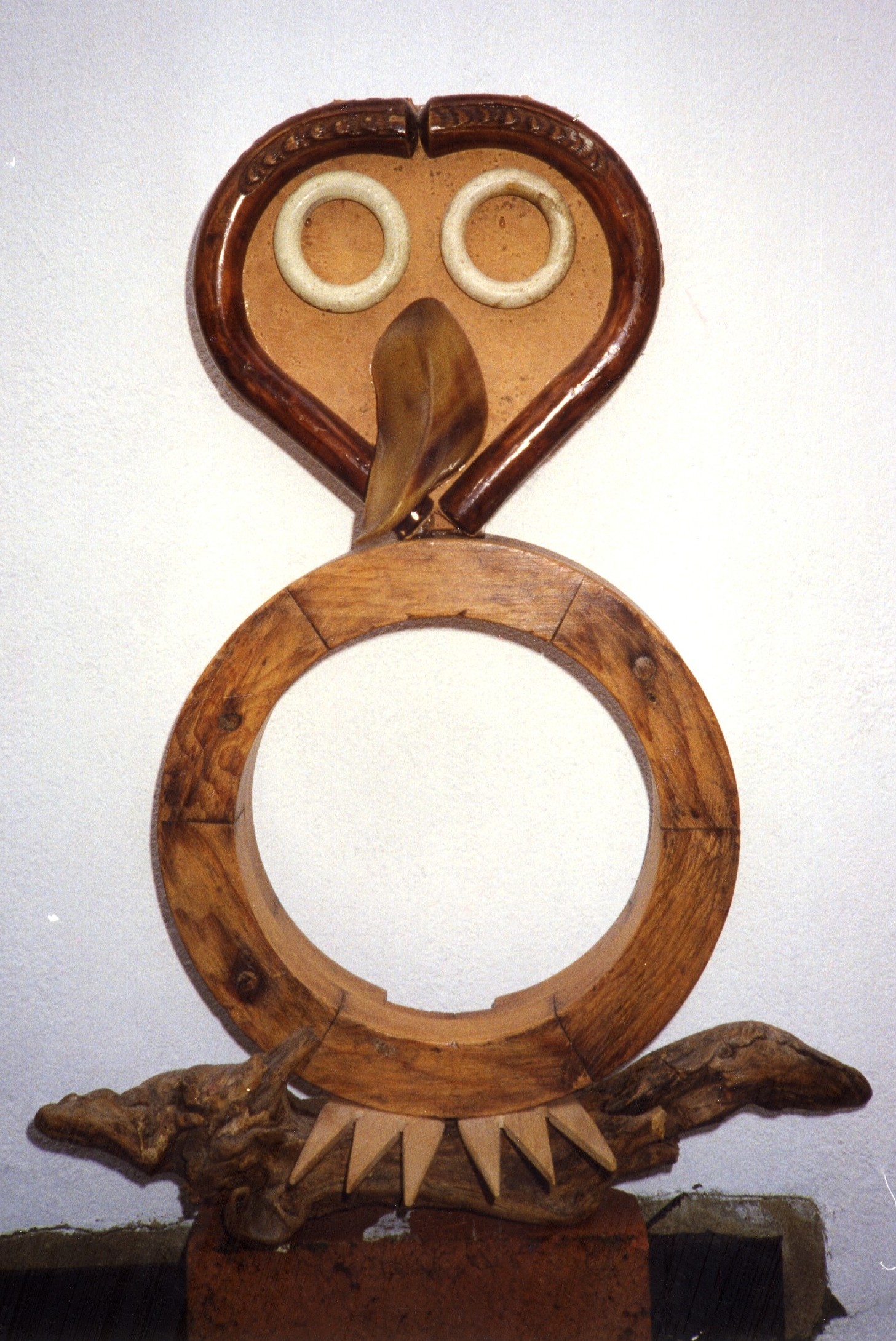 Description: This piece depicts an owl perched on a natural piece of wood. The owl’s body is formed by a hollow circle. Two feet, both with three spiky toes are tucked under the owl’s body. A flat wooden shape, complete with a rounded wood trim is attached to the top of the circle. The owl’s head is detailed with two pale wooden rings for eyes, and a projecting, outward and downward curving wooden beak.