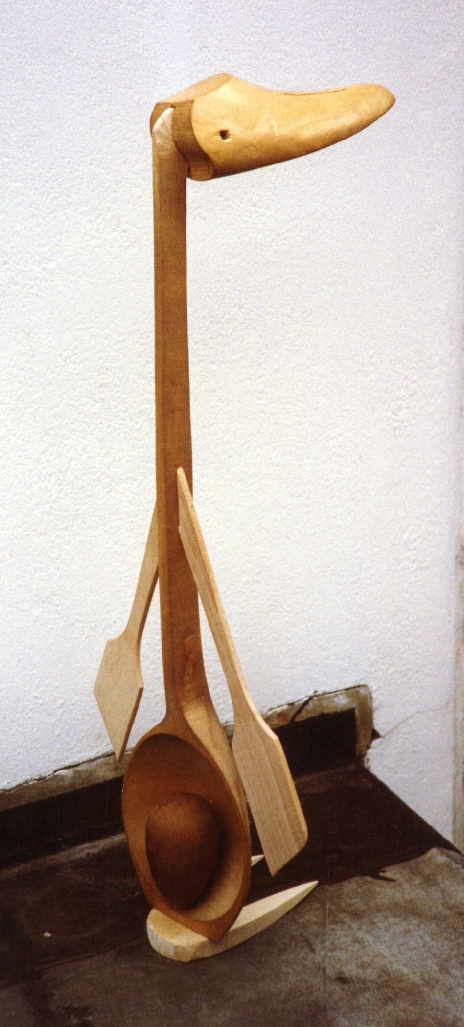 Description: This is a bird with a long neck. It could resemble a goose, duck, or even a penguin. The head is a shoe part with two holes for eyes. The long neck and body is a spoon. The backside is a wooden egg. The arms and small spatulas. The foot is two sharp triangles.