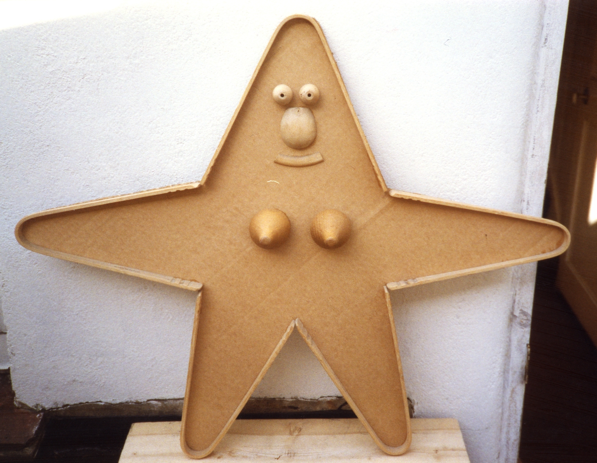Description: A star-shaped figure is made of thin board or cardboard, with flat, raised edges. The top point of the star is wider than the other four, and serves as the figure’s head. Two thinner points stretch out to either side, representing arms. Two points stretch downward, representing standing legs. Two small cones project from the center of the piece, representing breasts. In the top point of the piece, small wooden figures are attached to form two eyes, a large bulbous nose, and an upturned mouth.