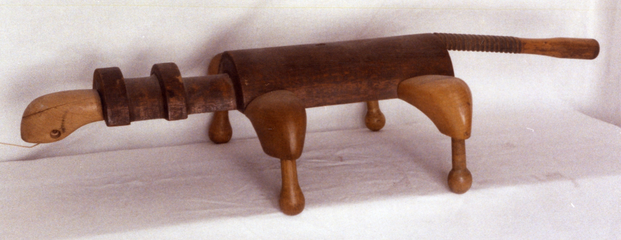 Description: A four-legged animal is formed from an assortment of wooden pieces of different shapes and finishes. The animal has a long torso, rounded feet, a long, ringed tail and a long, ringed, neck and a snake-like head.