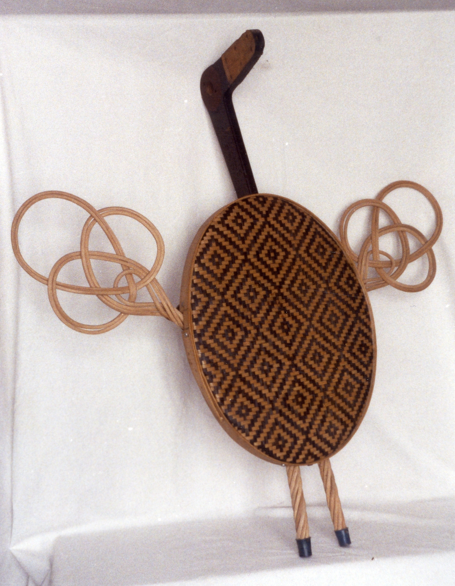 Description: A bird with widespread wings is formed by several forms. The body of the bird is formed by a large, round mat woven of rattan. Two wicker polls with black caps emerge from the bottom of the round mat, representing legs. Wicker rug beaters spread out from either side of the mat, representing the bird’s wings. A wooden L-shaped form emerges from the top of the mat, forming the bird’s neck and beaked head.