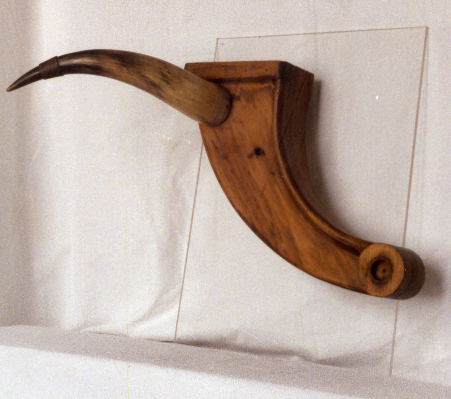 Description: This simple piece is composed of two forms: a segment of a wooden curve, which anchors another, protruding wooden form: a more organic, curved wooden form in the shape of a horn.