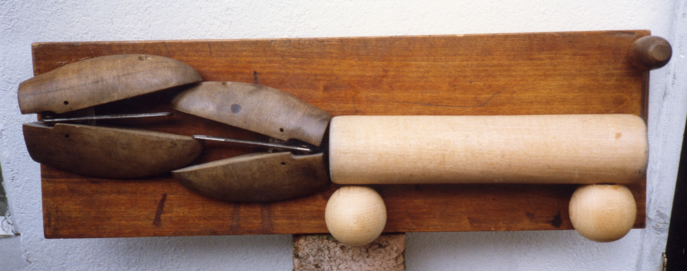 Description: The profiles of two animal-like figures meet at the mouth. Each of their heads is represented by two curved wooden forms hinged open, with a thin wooden tongue. The piece includes the body of the figure on the right, which is formed by a long cylindrical block with two rounded legs. A rectangular wooden board frames the piece.