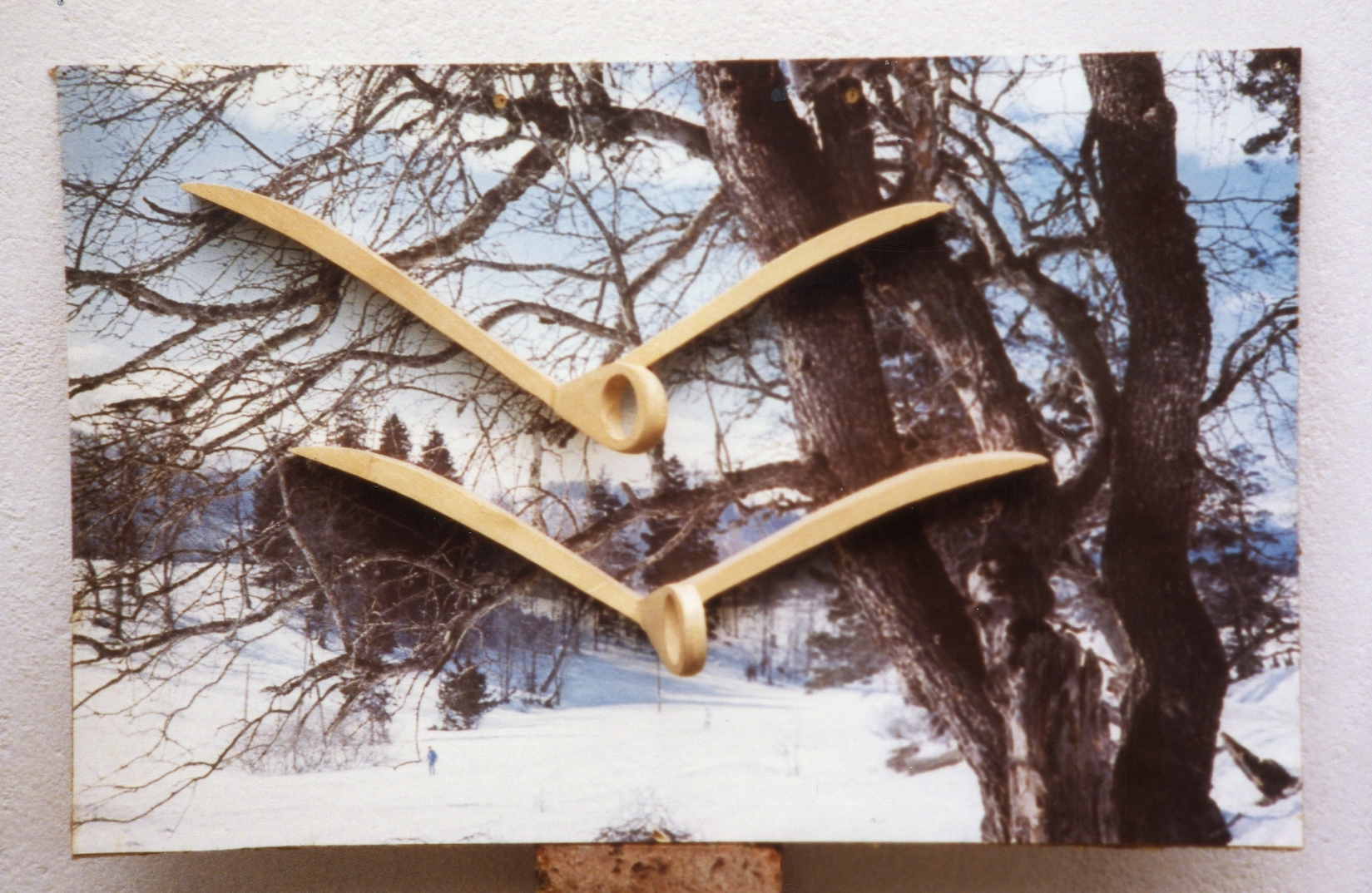 Materials and Techniques: Found winter landscape reproduction, wood cogs