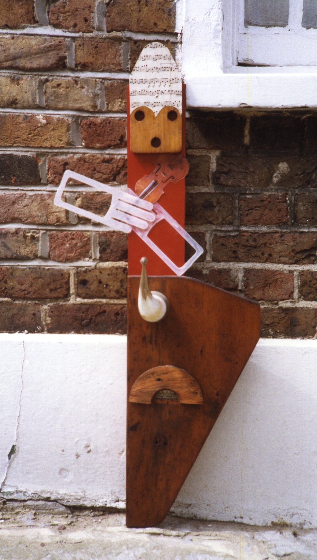 Description: Assorted wooden frames are assembled to form a violinist. His lower half is shaped from a triangular shape that juts out far to the right. A wooden arch is attached midway up the triangle. A protruding turn-handle is attached on the triangle above the arch. The musician’s torso is represented with a red triangle. His two arms look to be made of paper cut outs of five fingers attached to hollow rectangles. These paper arms hold a cut out photograph of a violin, held under his chin as if to play. A light wooden rectangle forms the player’s head, which is capped with a dome-shaped cut out from a page of sheet music. His face is detailed with three black circles: two eyes and a mouth.
