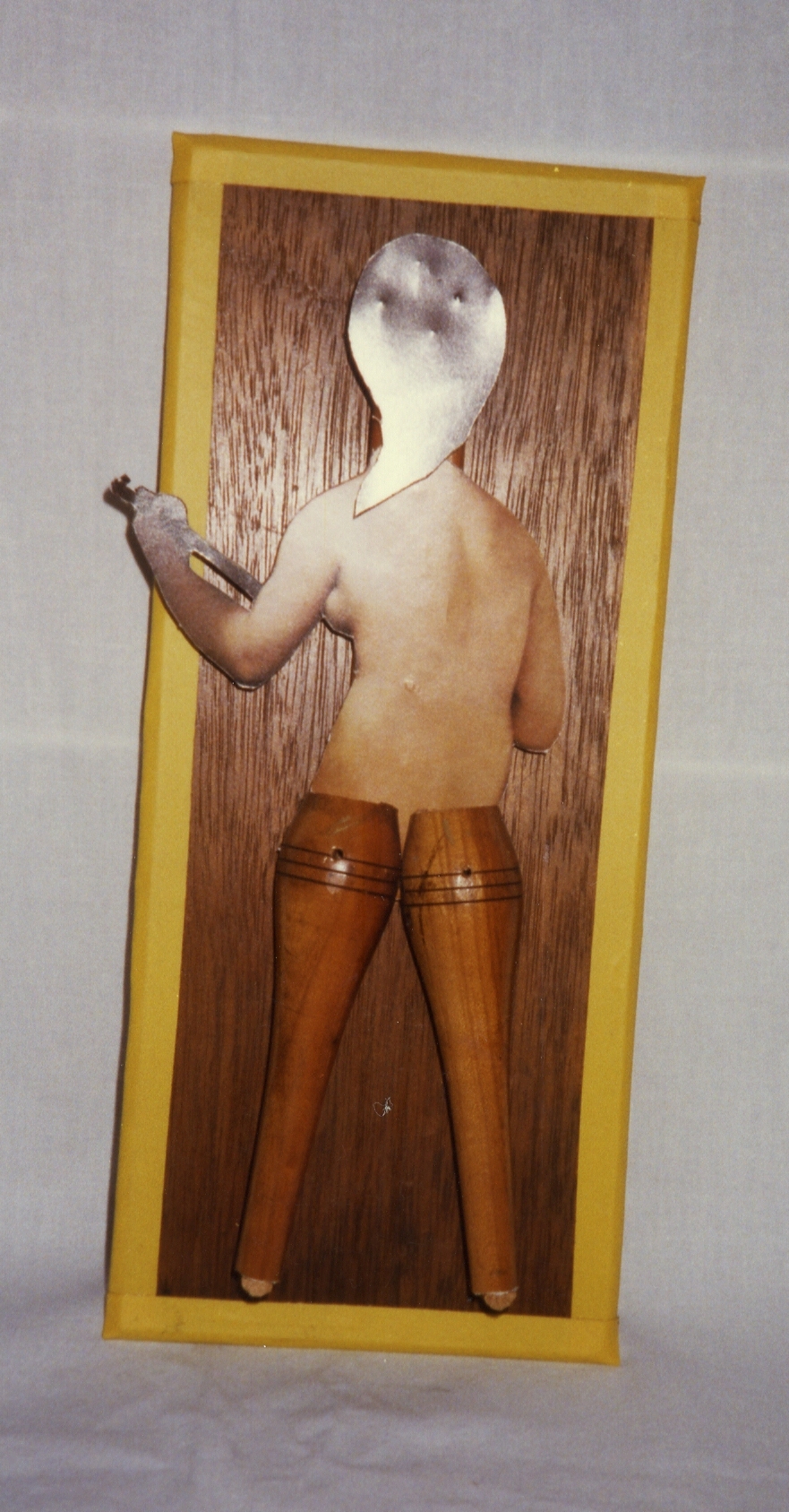 Description: Mounted on a wood board with a painted yellow frame, is the back of a nude figure. The back is a paper cutout of a nude form holding a gun and the legs are wood pieces. A metal cutout makes up the air.