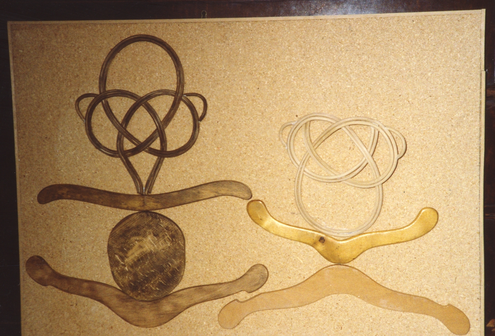 Description: A male and female figure are mounted to a wood particle board. They have their arms and legs outstretched as if they are jumping. The female figure is smaller, with a rug beater head to represent curly hair. The male figure is larger, with a large circle for the body, and a rug beater head to represent a bushy mustache and ears.