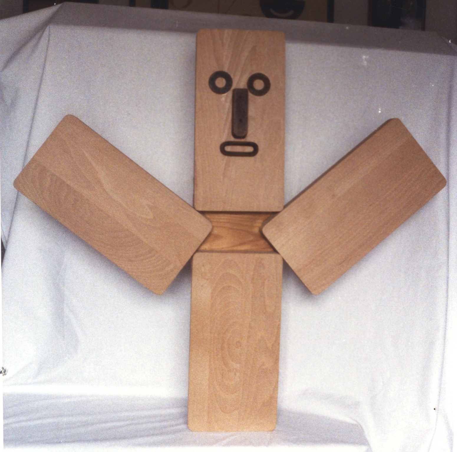 Description: Four blond wooden rectangles are attached to a fifth, smaller wooden rectangle. Two extended vertically in opposite directions, while the other two are angled out from the remaining two sides. Together, they represent a standing figure with outstretched arms. Four small, dark wooden pieces are attached to the figure’s face. Two identical rings represent eyes. Below this a long oval represents a nose, and below this an oblong ring represents a mouth.