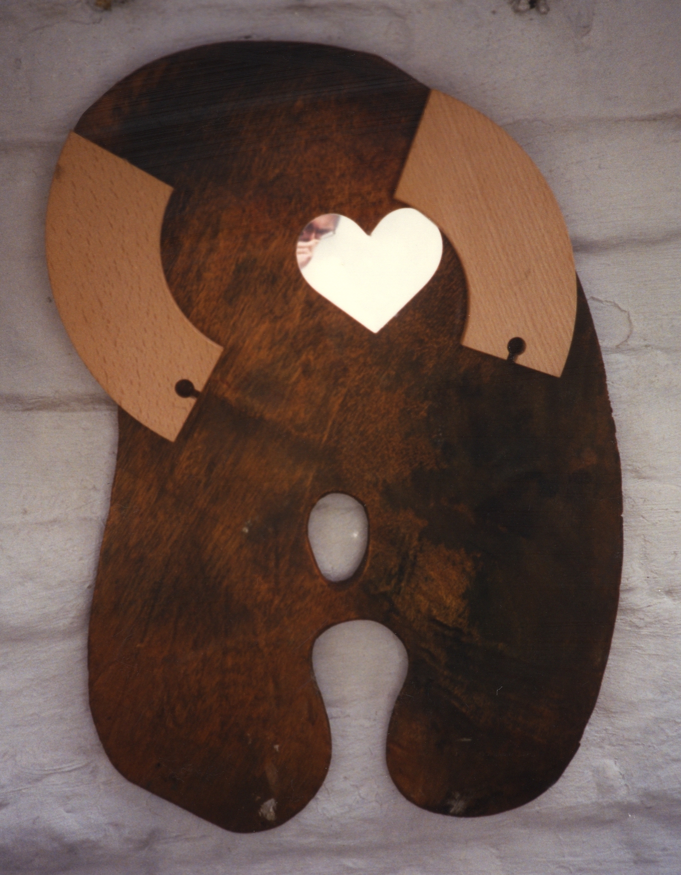 Description: Curved wooden toy train tracks are attached to either sides of an oblong painter’s palette, to form the arms of a headless body. A shiny, aluminum heart is attached over the left chest area.