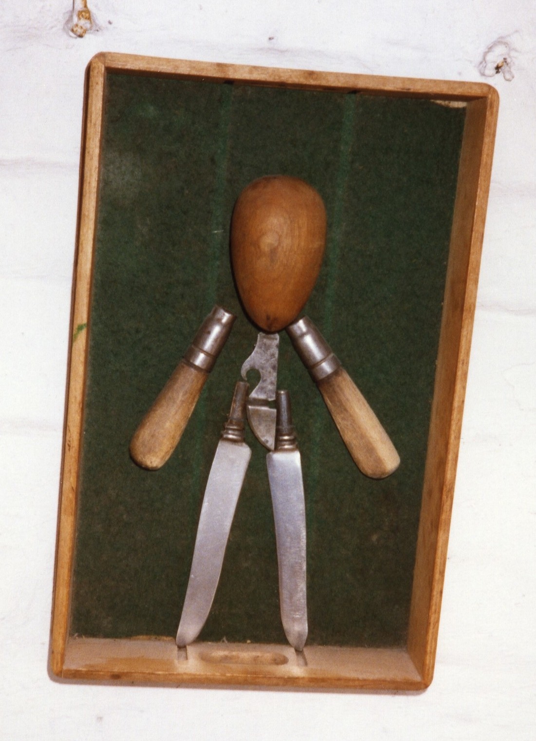 Description: The figure of a man stands within a vertically-oriented wooden box. Table knife blades form the man’s legs, which are attached to his metal torso. Two wooden and metal tool handles form the man’s swinging arms. His head is a bulbous wooden knob.