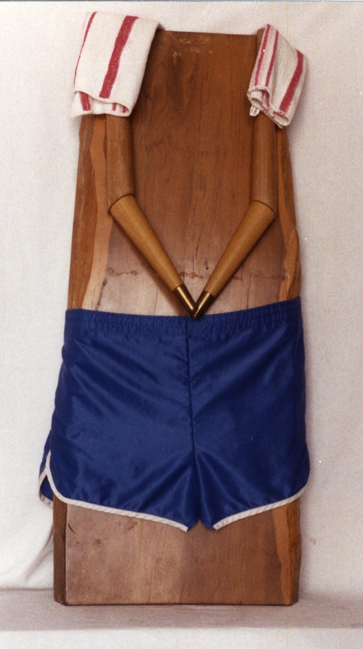 Materials and Techniques: Wood board, hand towel, gym shorts, assorted wooden forms, metal trim