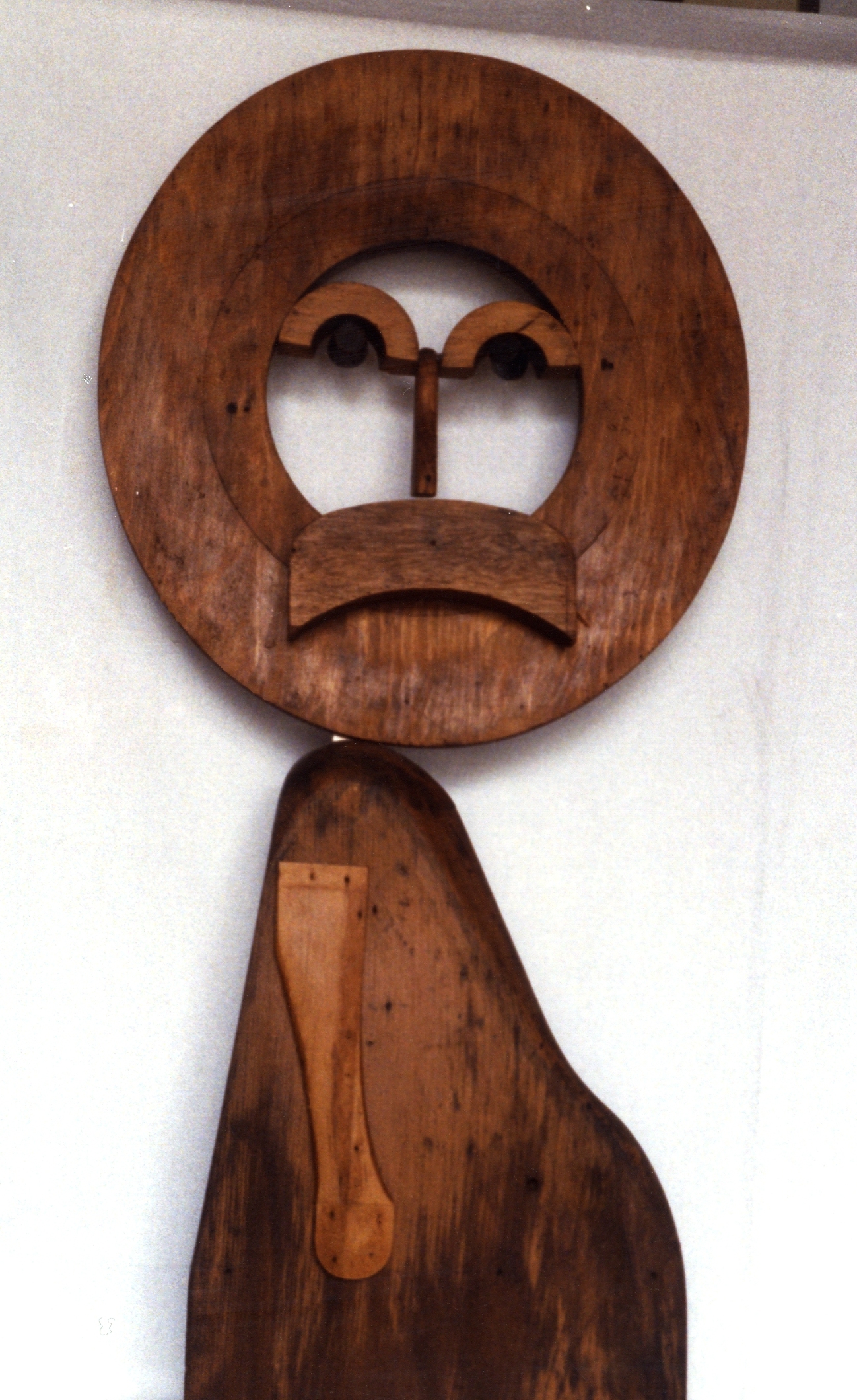 Description: Assorted wooden forms are assembled to represent a figure sitting in profile, with his forlorn face turned towards the viewer. The figure’s body is represented by a single, lumpy form, with a worn black finish. One arm, hanging by his side, is attached. The figure’s head is formed by a large wooden ring, which also shows significant wear. A “T”-shape is formed by thin wooden strips. The vertical strip forms a nose, while two small semicircles perch on the horizontal strip to form eyes. A down turned slice of a thick arc is attached to the outer ring, representing the figure’s frown.
