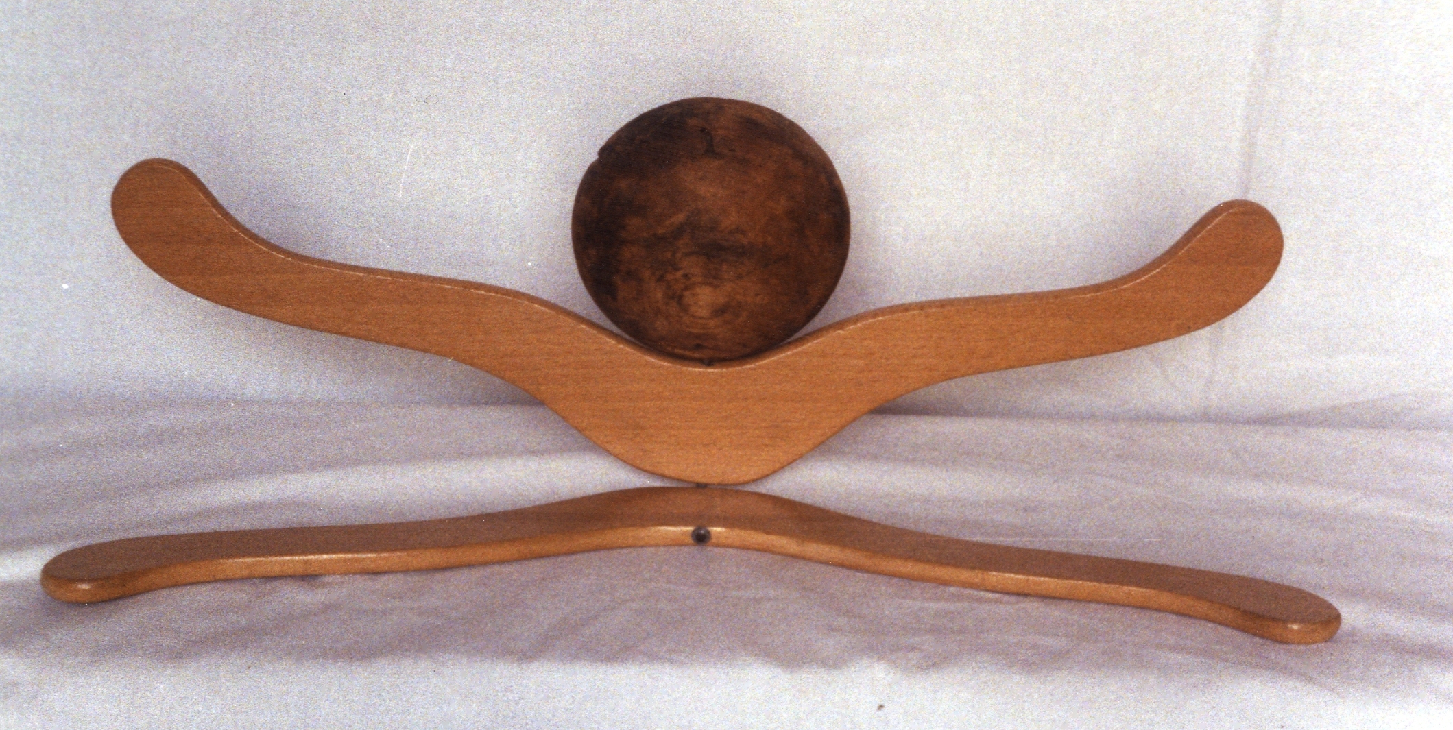 Description: The arms of two wooden hangers are attached to a wooden disc to form a figure doing the splits. One hanger lays flat, representing the outspread legs. The other hanger is attached is attached at the neck and upturned, representing the figures outspread and raised arms. A wooden disc rests in the curve of the upturned hanger, representing the figure’s head.