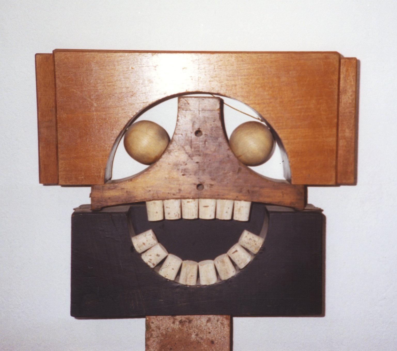 Description: Assorted wooden forms are assembled to form a grinning face, with a full mouth of teeth revealed. A wooden rectangle with a half-circle cut-out serves as the lower half of the face, which is capped by a larger rectangle also with a half circle cut-out. A triangular piece sits between these to represent the plane of the face. Wooden balls are wedged within ellipse-shaped holes to represent the face’s two eyes. Rows of corks form the teeth.