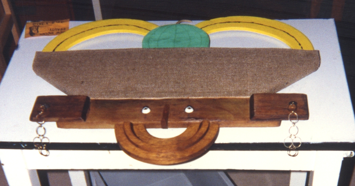 Description: Inspired by Carmen Miranda, this 2D face has a large decorated headdress. A curved wood piece makes the shape of the chin and mouth, a long piece with two holes creates the eyes, face, and ears. Dangling from the ears are gold hooped earrings. The headdress is a large shape that extends out with two painted yellow banana like curves coming from the top that meet at a green circle at the center.