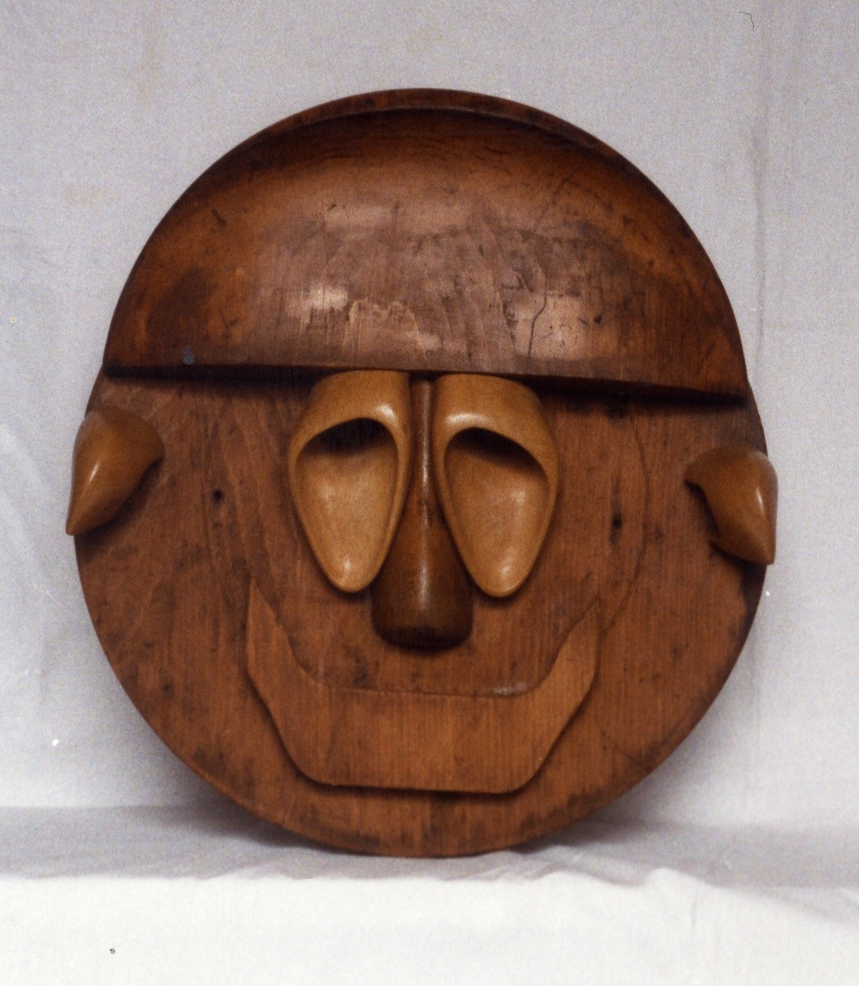 Description: Assorted wooden pieces are affixed to a flat, wooden disc to form a helmeted, smiling face. The upper portion of the disc is covered by a semicircle. Eyes emerge from under the semicircle, formed by hollowed wooden shapes, and sandwich a wooden nose. An angled wooden arch rests below these forms, representing an upturned mouth. Two small, identical wooden objects are affixed below the line of the semicircle on either side, representing protruding ears.