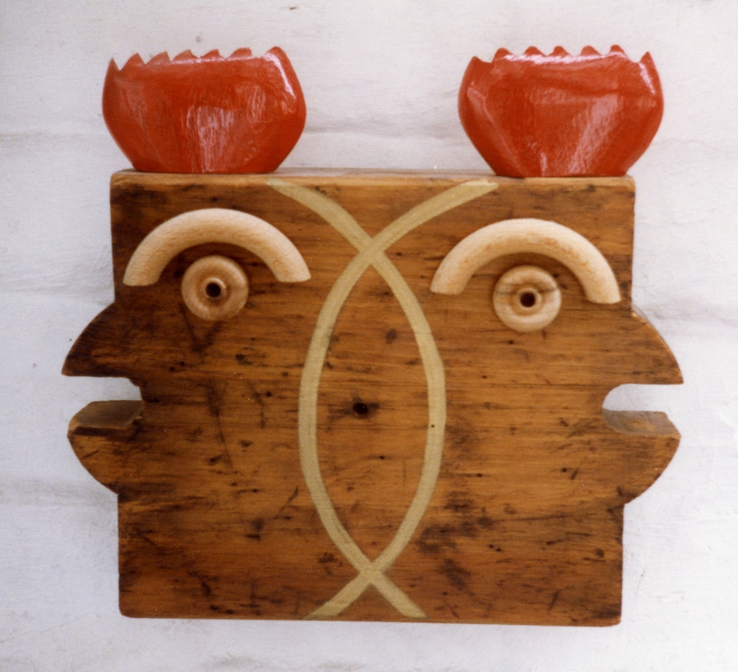 Description: Two faces turned away from each other in profile are represented on a wooden block. The block is flat on the top and bottom. On either side, a hemisphere emerges from the block, with a “U”-shaped indentation in the middle of the hemisphere. On each respective side, these represent the nose and mouth of the face. Two painted or carved curve down the middle of the block, representing the back of each face’s head. Additional wooden pieces are attached to the face, representing arched eyebrows and round eyes. A red hat with a variegated top edge sits on the flat top of each head.