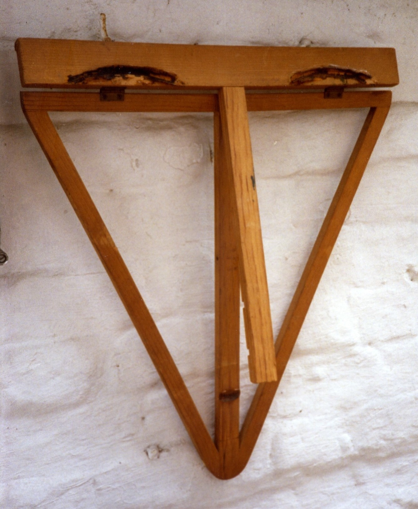 Description: Six thin, flat wooden sticks of roughly the same length combine to form a face. Three of the pieces form an upside-down equilateral triangle. A fourth piece bisects the triangle. A fifth piece is placed atop and along the triangle, and detailed with painted-on eyebrows and eyes. The final piece is attached over the bisecting piece, but emerges towards the viewer at a slight angle, suggesting a nose. A marking on the wood under this, natural or added, may suggest a mouth on the face.