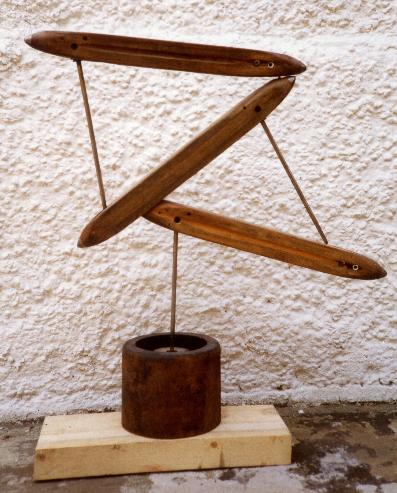 Description: Three wooden shuttles are attached by wooden rods to a cylindrical wooden base. The shuttles meet at angles on their ends, together forming a “Z” shape.
