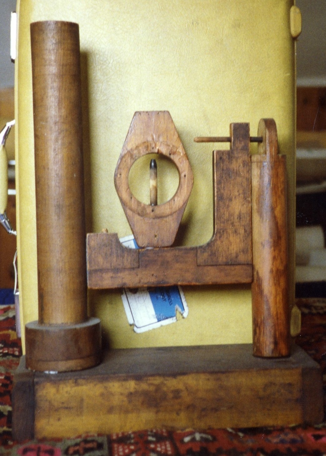 Description: This piece is composed of assorted wooden forms. A wooden block anchors the piece on the bottom. From either sides rise wooden cylinders. Assorted forms of various shapes, sizes, and finishes span the two cylinders, including a nearly white hexagon in the middle, with a black hole in center which holds a small, light wooden form.