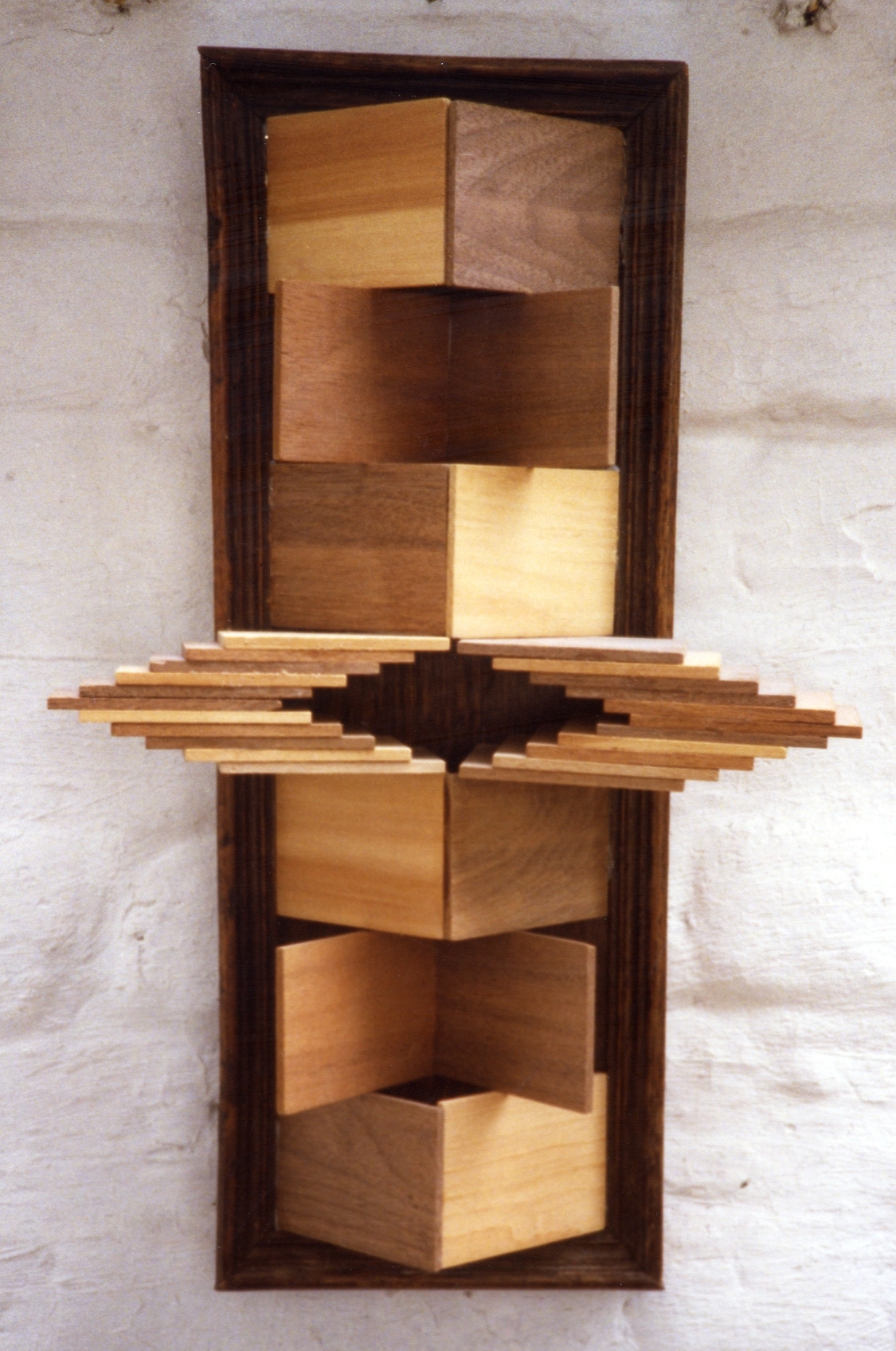 Description: Wooden squares of many finishes are arranged within a long, rectangular wooden frame. In three rows at the top and bottom of the piece, two pieces are placed to form right angles, alternating facing in, towards the back of the wooden frame, and out, towards the viewer. In the middle of the piece, wooden squares are stacked in a stair-like fashion around a central, dark hole into the middle of the dark wooden frame.