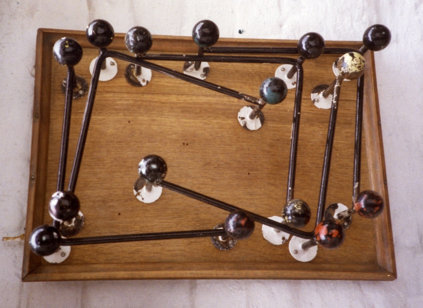 Description: Assorted metal sticks and balls are attached to a wooden tray to form a lattice of sorts. The balls and sticks are primarily black, but chipping paint reveals white and red beneath.