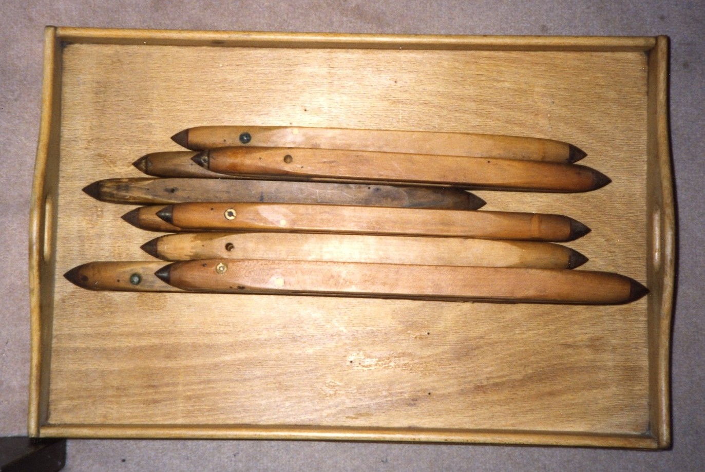 Description: A pile of weaving shuttles, layed out horizontally, are mounted to a serving tray. There are 10 shuttles in total. They reach from end to end on the tray. There are 6 rows of shuttles and 3 of them have another shuttle on top.