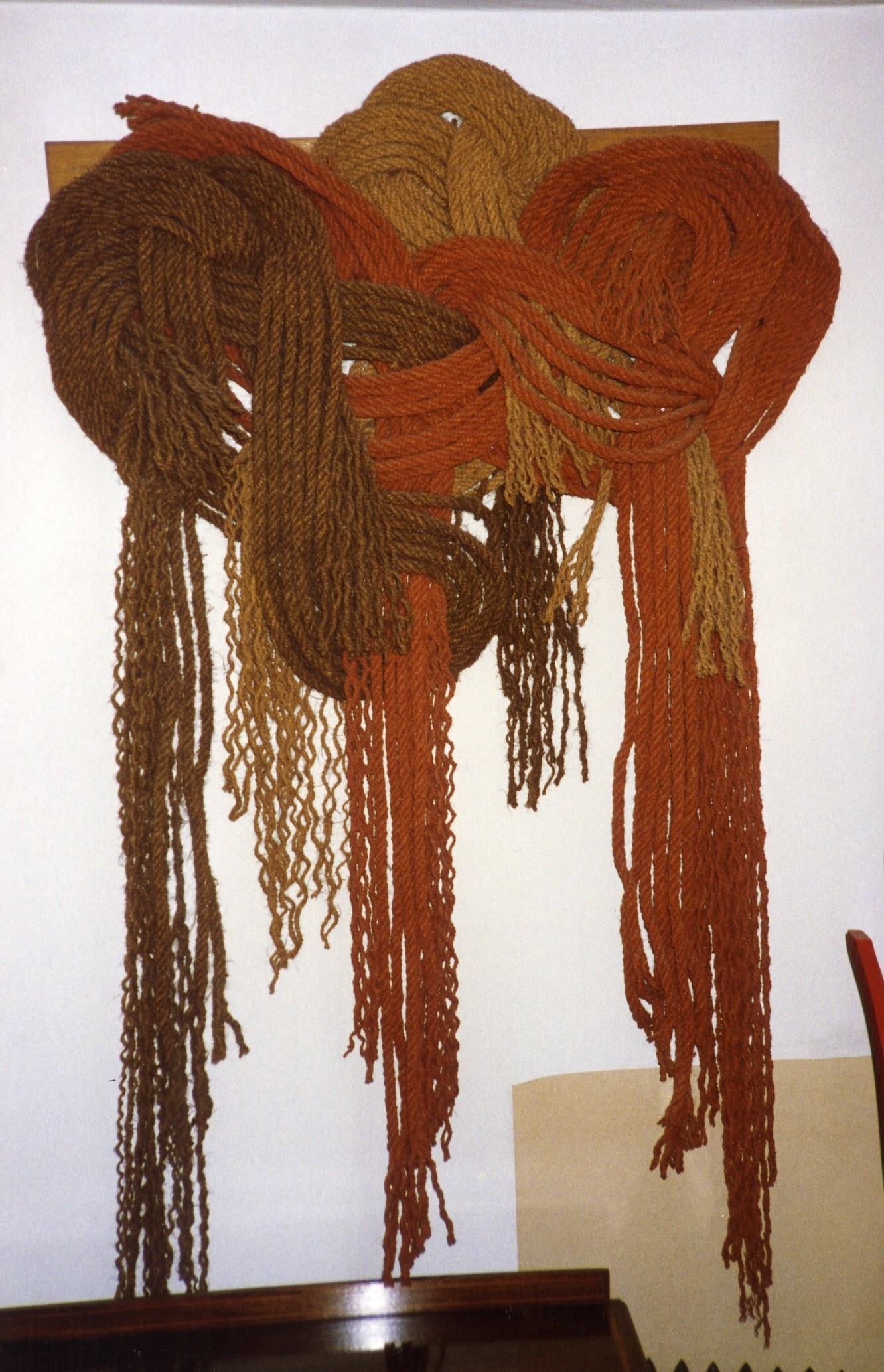 Description: Three large, flat knots of yarn are mounted on a wooden board: burgundy on the left, burnt orange in the middle, and a vibrant red on the right. The knots intersect in the middle. Their loose ends hang down below the knots, and appear to have started to unravel.