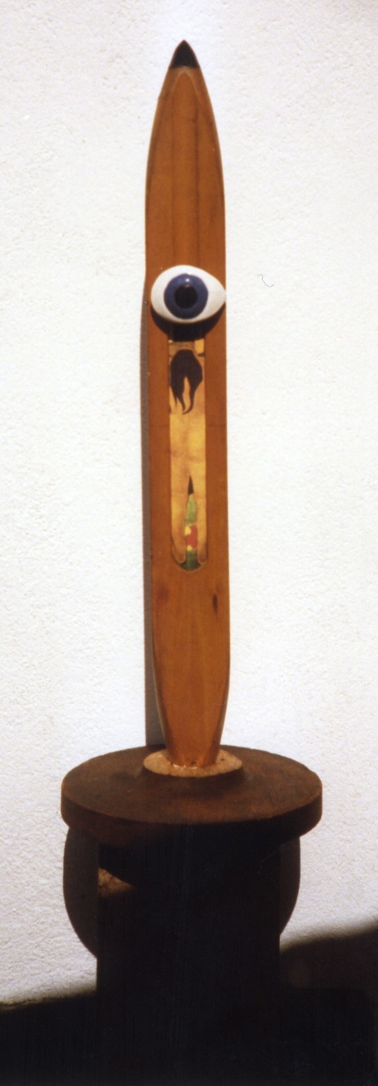 Description: A tall wooden spear-shaped piece is mounted in a round, wooden disc. The top of the wooden piece is darkened, and additional detailing exists in the middle. A single plastic eye is mounted on the upper register of the piece.