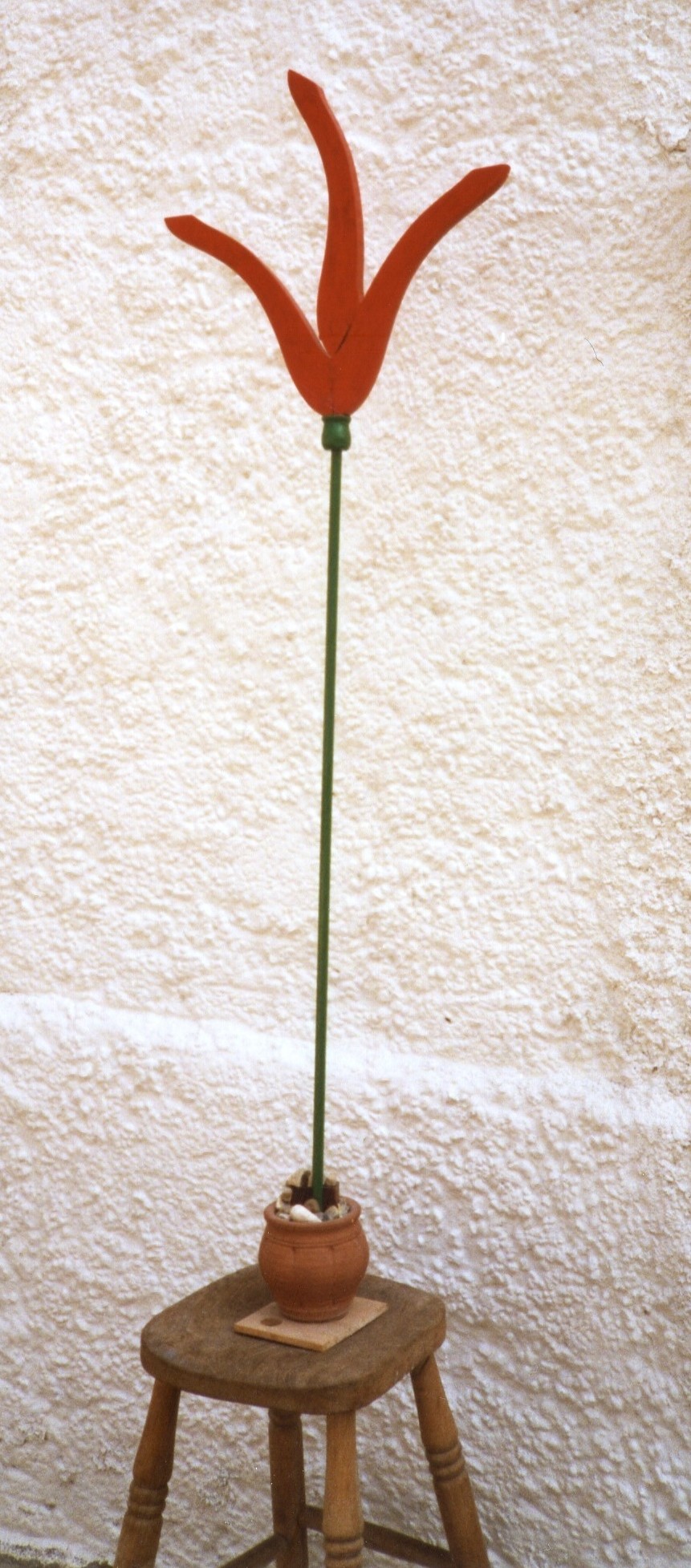 Description: This plant is in a very small pot. It extends upwards with a tall, thin, green wooden dowel stem. The top are three halves of wooden hangers, painted red. They represent the flower petals.