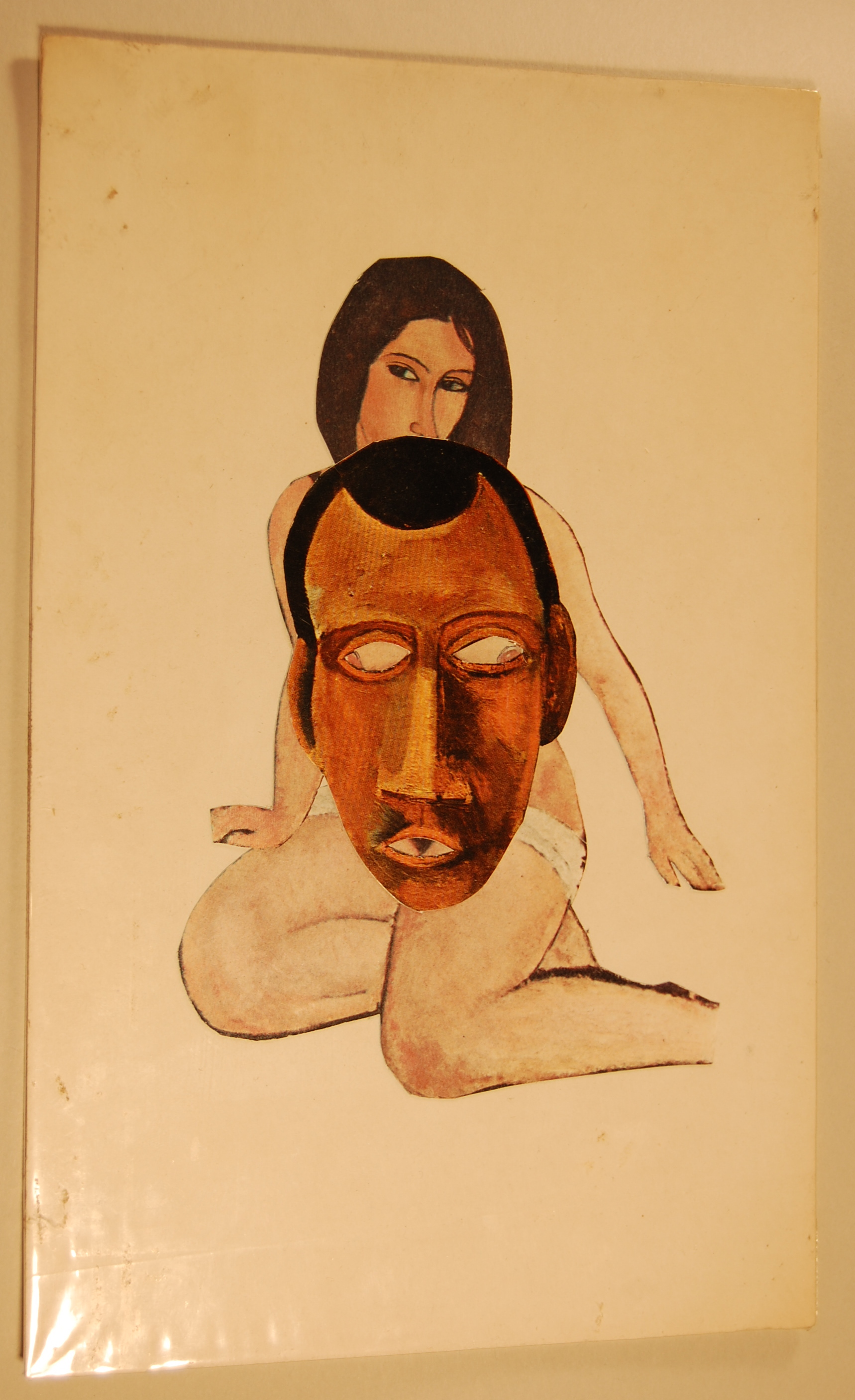 Description: The image of a reclining female nude (Sitting Nude, Amedeo Modigliani, Italian, Livorno 1884-1920 Paris, Royal Museum of Fine Arts Antwerp) is partially obscured from the area of her mouth to her mid-thigh by the image of a man’s face. His eyes and mouth are cut out, exposing the woman’s nipples and pubic area. Each nipple is exposed through each of the man’s eyes, representing his pupils. The woman’s pubic area appear as a tongue, visible through a cut out in the shape of the man’s mouth.