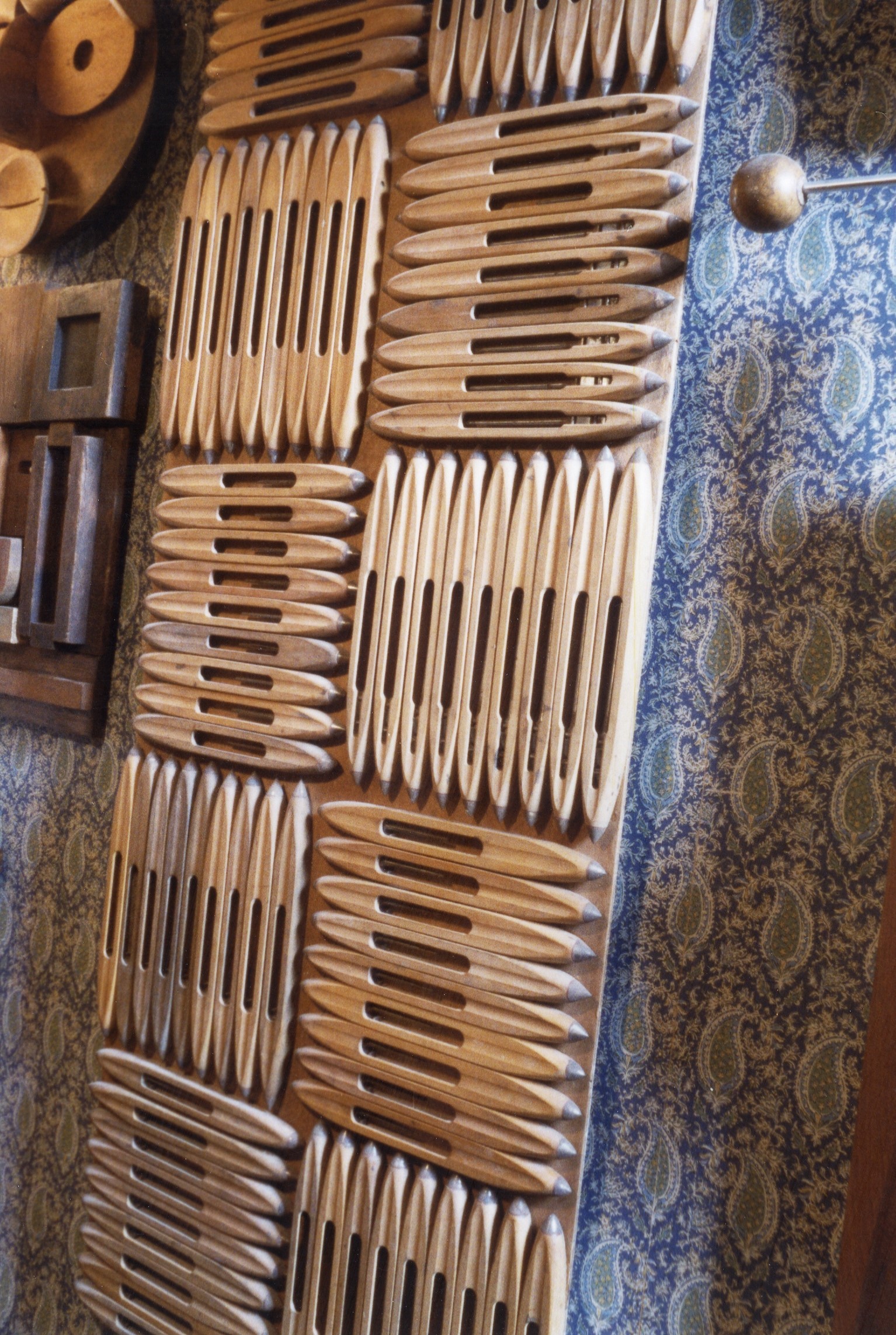 Description: Wooden shuttles are attached in a pattern on a large, rectangular wooden board. The shuttles are organized in groups of nine. There are ten groups of shuttles, formatted as two rows of five groups. The groups alternate between horizontal and vertical orientation, in order to form a checkerboard pattern.