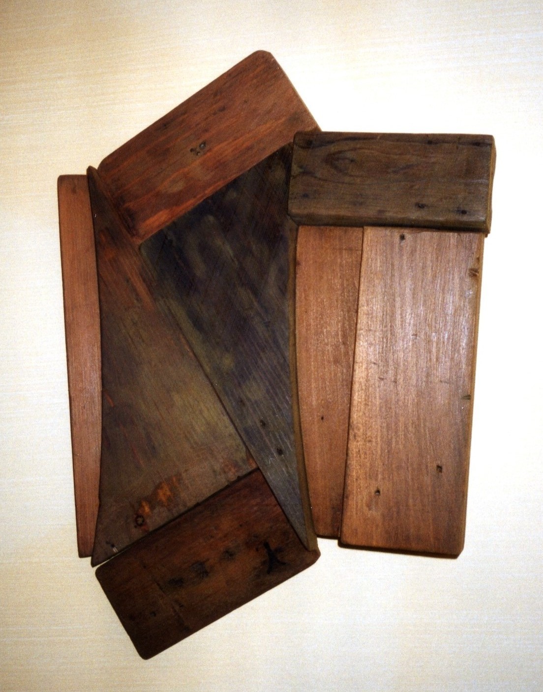 Description: Wood blocks of various sizes and colors fit together like a puzzle to form this new organic shape.