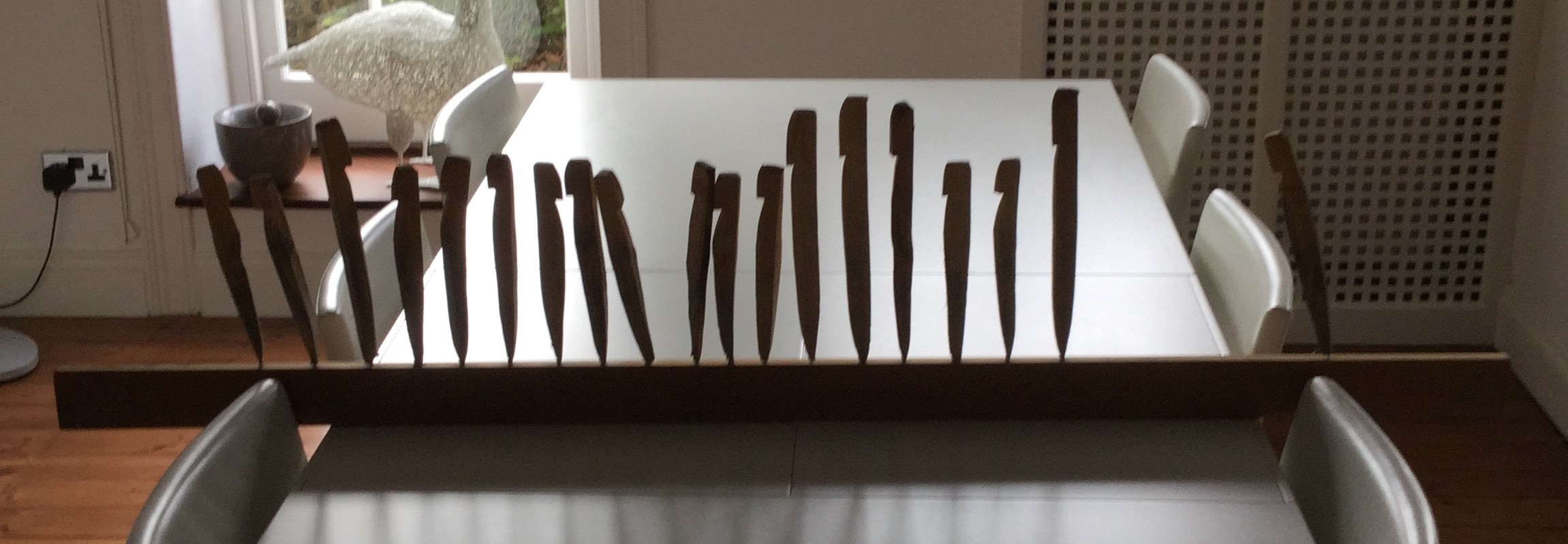 Description: On a long thin wood plank is a row of small people. There are 18 figures in total. They are all a similar shape to resemble a person, but they vary in sizes. Some are taller than others.